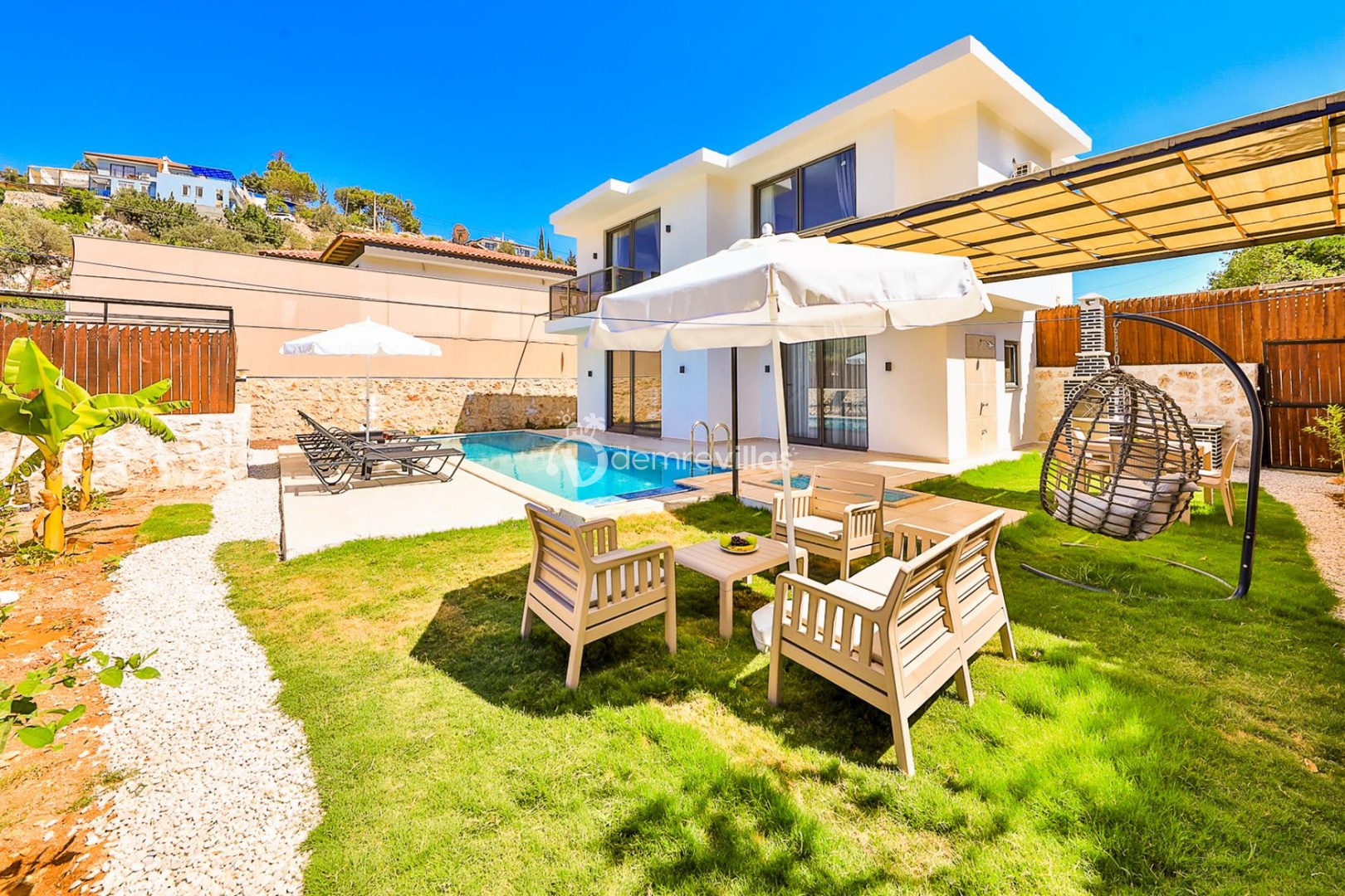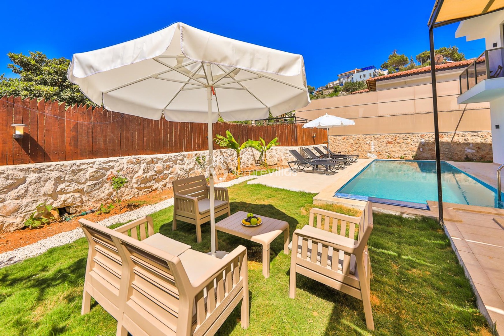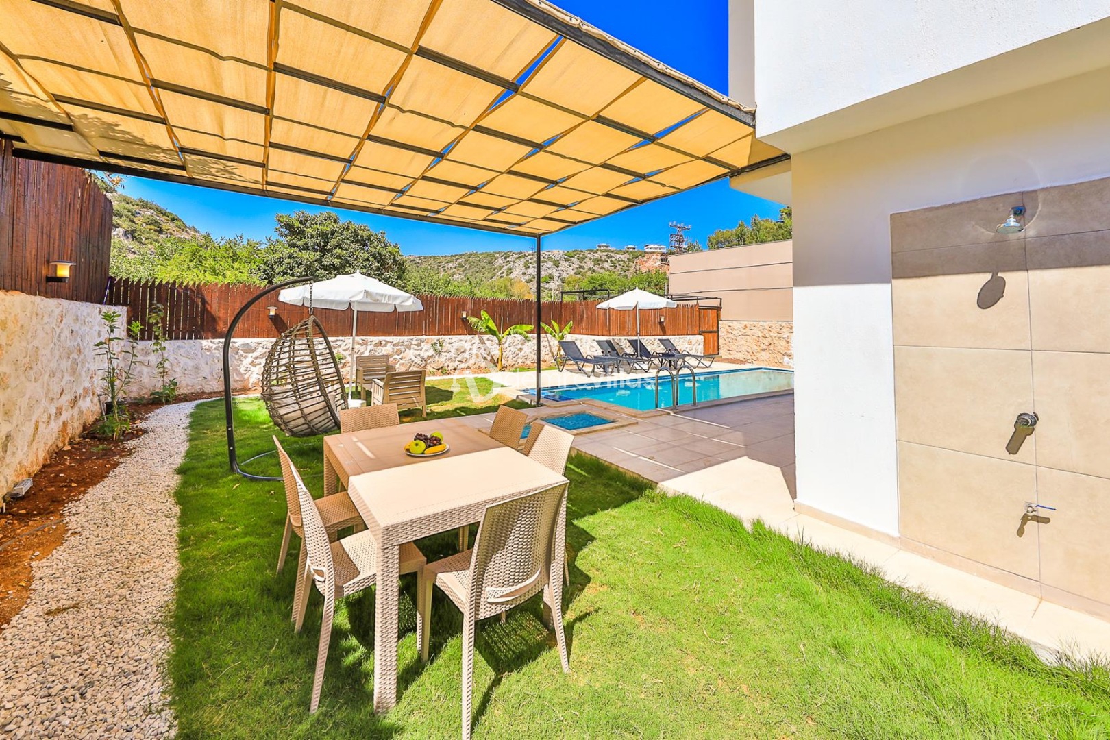 Havuz ve Bahçe: Havuz ve bahçesi korunaklı olup dışarıdan gözükmemektedir. Özel yüzme havuzu, şezlong, şemsiye, salıncak, yemek masası ve barbekü bulunmaktadır.