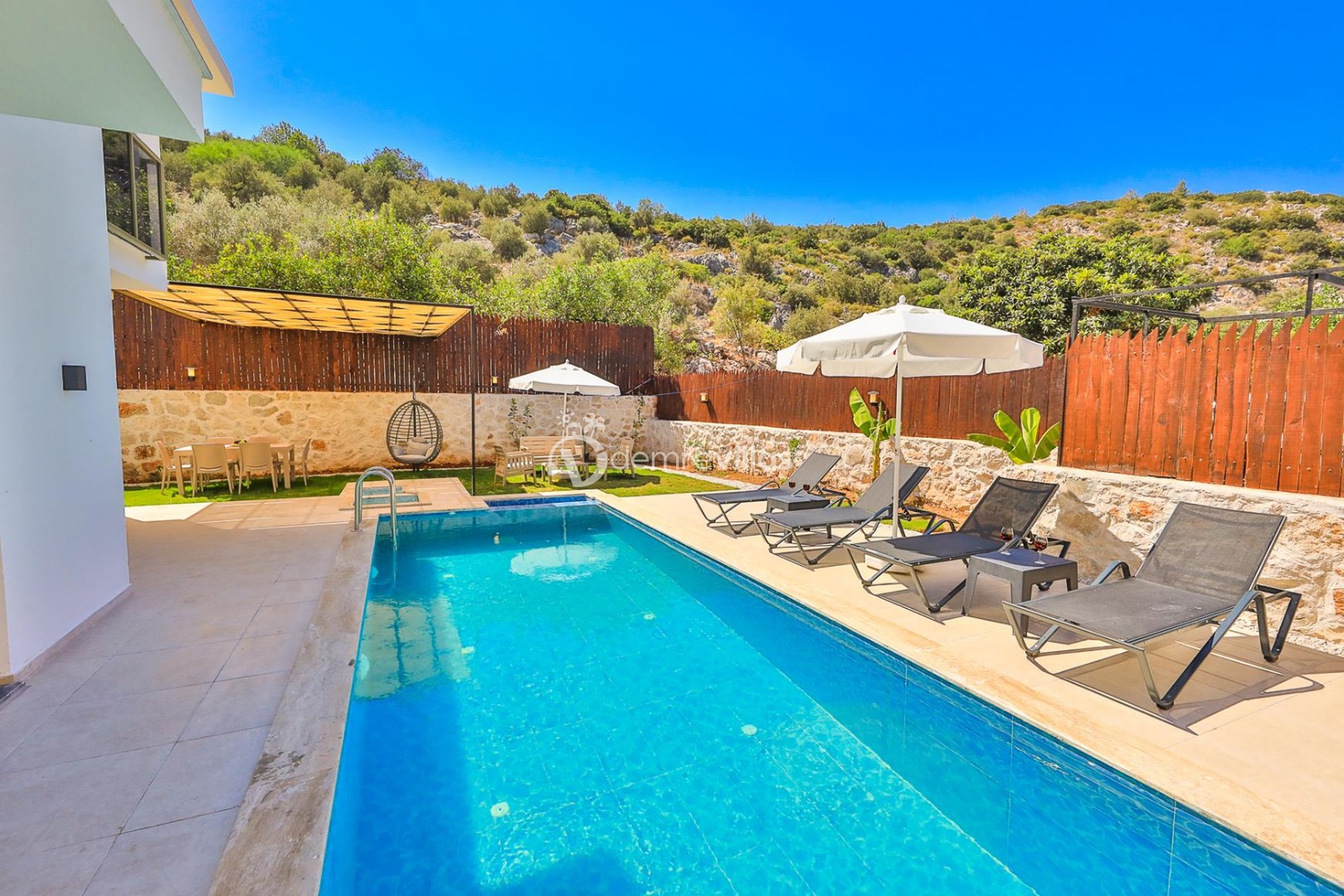 Doğa içinde bir konuma sahip olan tatil villamızın havuz alanı sizlere keyifli bir tatil ortamı sunmaktadır. Balayı çiftleri ve çekirdek aileler için ideal bir seçenek olan muhafazakar hassasiyete sahip misafirlerimiz içinde uygun bir tatil ortamı sunmaktadır.