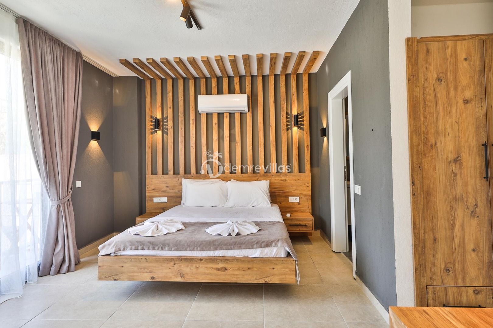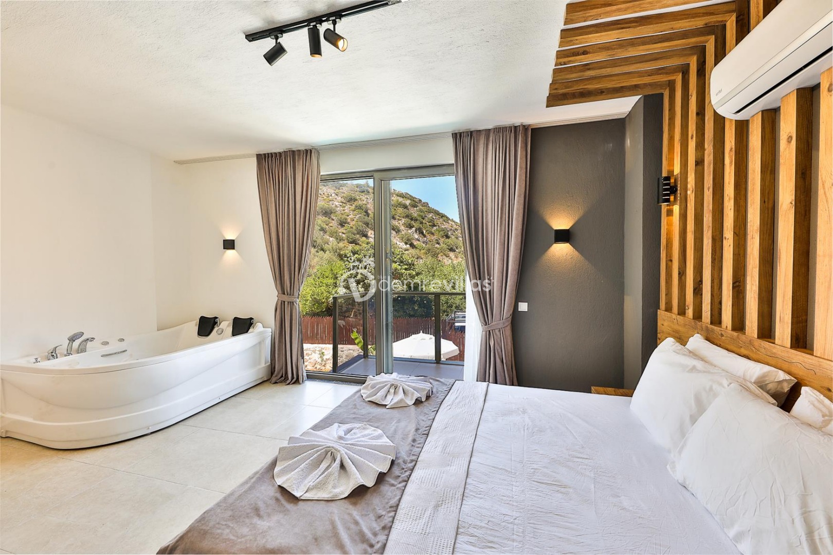 1. Yatak Odası: Çift kişilik yatak, klima, jakuzi, komodin, elbise dolabı, makyaj masası, banyo ve tuvalet bulunmaktadır.