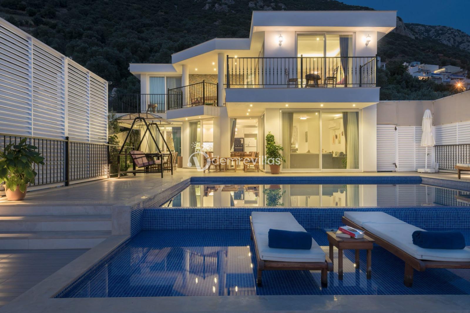 Villamız şehir merkezine yakın bir konumda olduğu için düşük sezonlarda hava sıcaklığı avantajı vardır. Köyler ile merkezin hava ve su sıcaklığı farkı 5 ile 8 dereceye kadar çıkabilmektedir. Şehir merkezine yakın ancak şehrin gürültüsünden ve karmaşasından uzak olan villamız, Kalkan merkeze 3-3,5 km ile yaklaşık 5-7 dakikalık sürüş mesafesi uzaklıktadır. Villamızın etrafı muhafazakar hale getirilmiş olup, meraklı gözlerden uzak tatil yapmak isteyen konuklarımıza, muhafazakar ailelere ve balayı çiftlerimize çok uygun bir villadır. Villamız içinde ihtiyacınız olan tüm mobilya mutfak araç gereçeleri ütü saç kurutma makinesine kadar mevcuttur.Villamızda muhteşem deniz manzarası eşliğinde keyifli bir tatil geçirebilirisiniz.