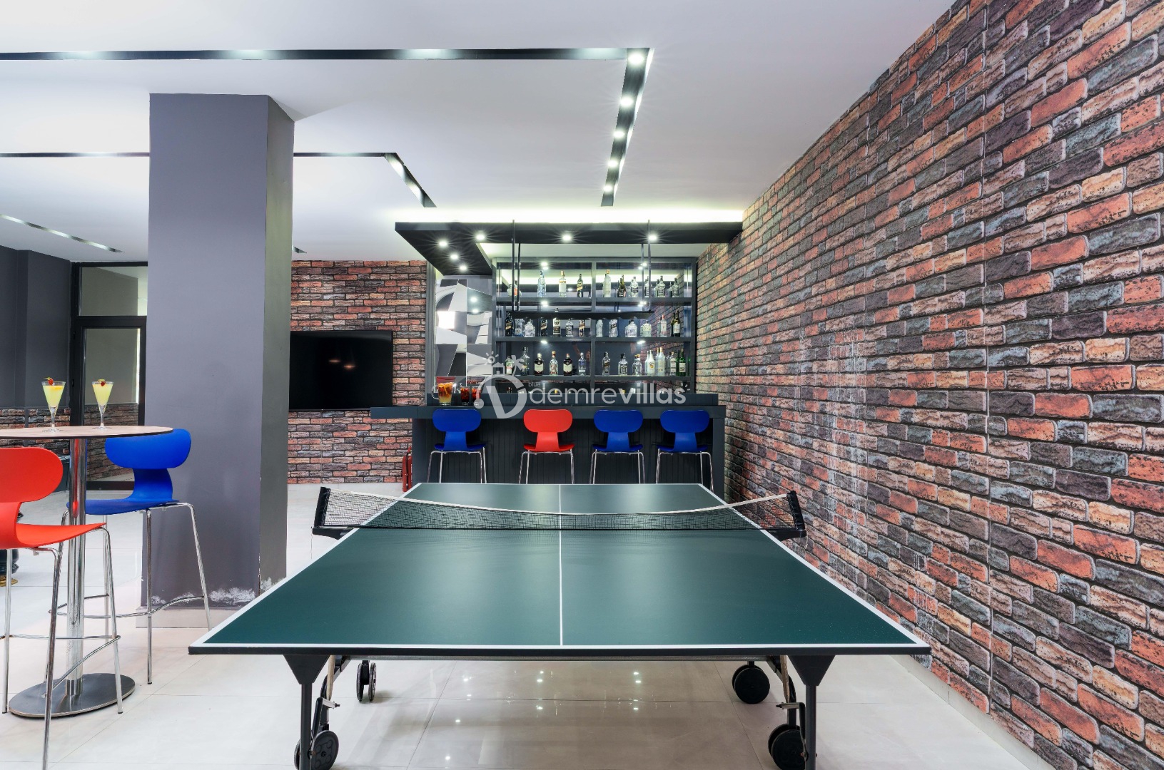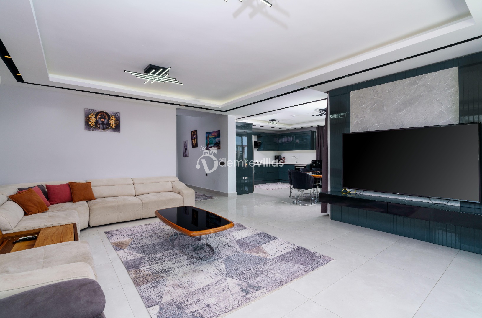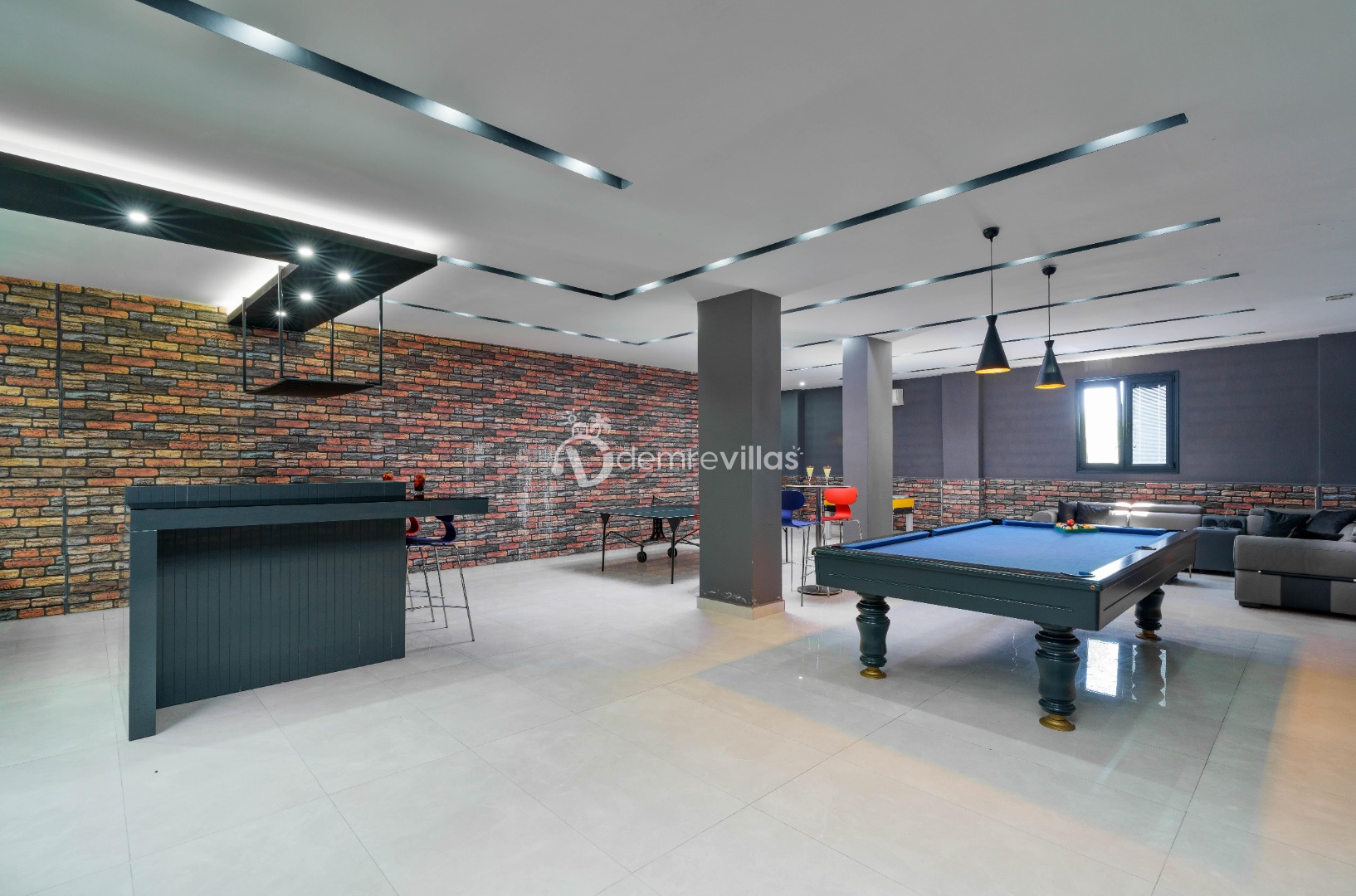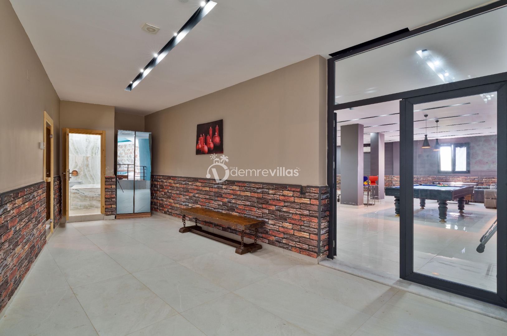 Modern oturma grubu, TV, masa ve sandalyeler, klima, bilardo, langırt, sinema odası, sauna, hamam bulunmaktadır.