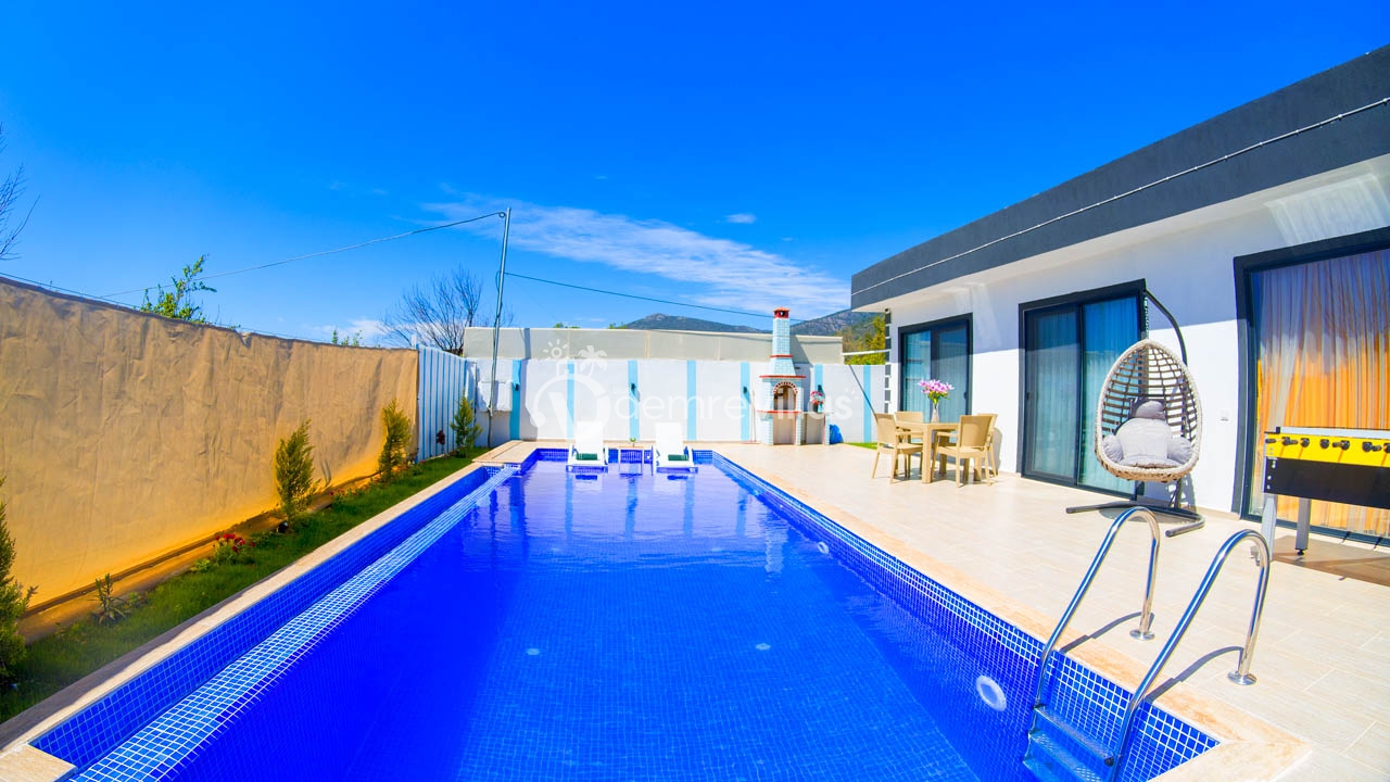 Bahçe : Korunaklı olan bahçemizde; özel havuz, salıncak, bahçe mobilyası, 2 adet şezlong, güneş şemsiyesi, şömine, 4 kişilik sandalye ve masası bulunmaktadır.