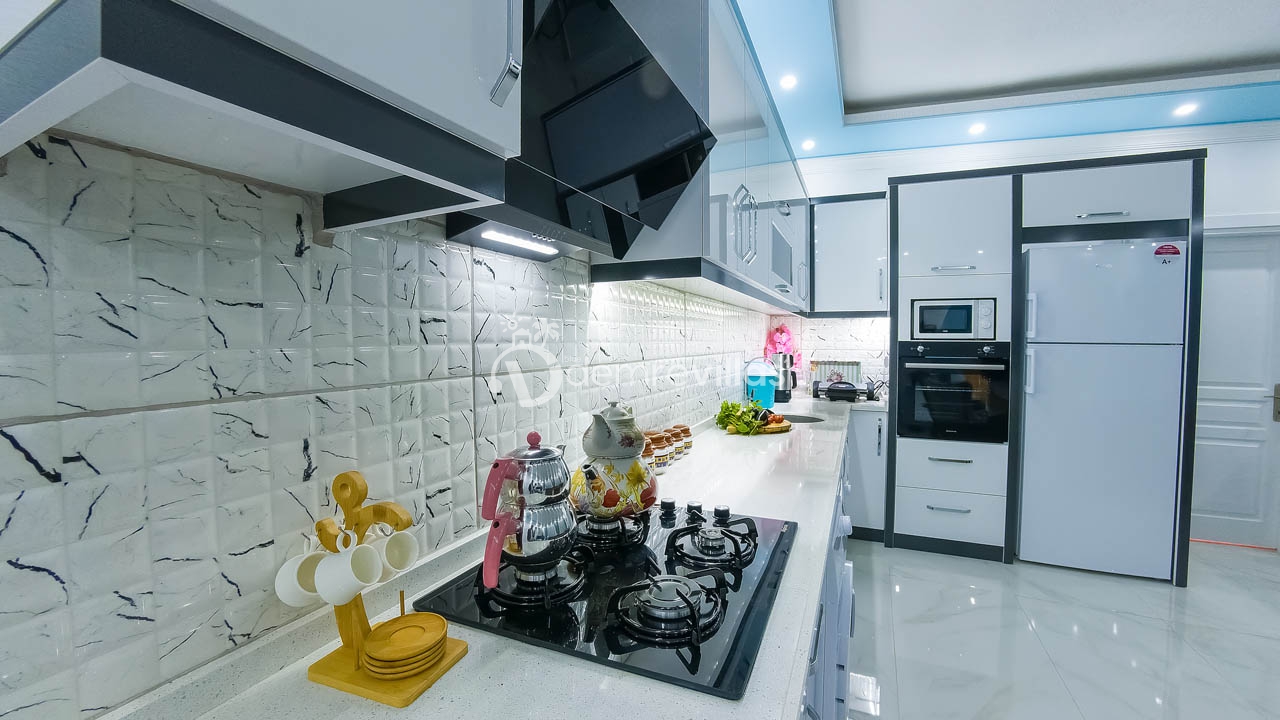 Mutfak : Amerikan mutfağımızda; buzdolabı, bulaşık makinesi, çamaşır makinesi, kettle, çatal&bıçak takımı, yemek takımı ve gerekli tüm mutfak ekipmanlarından oluşmaktadır.