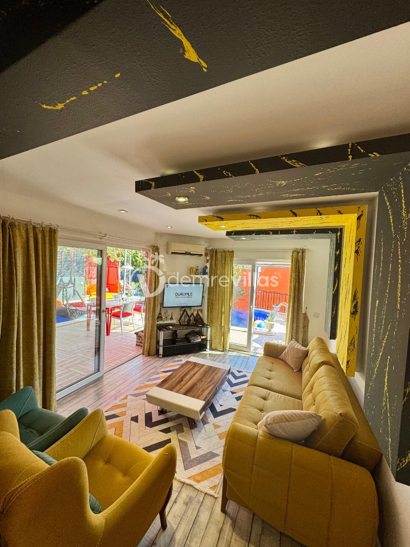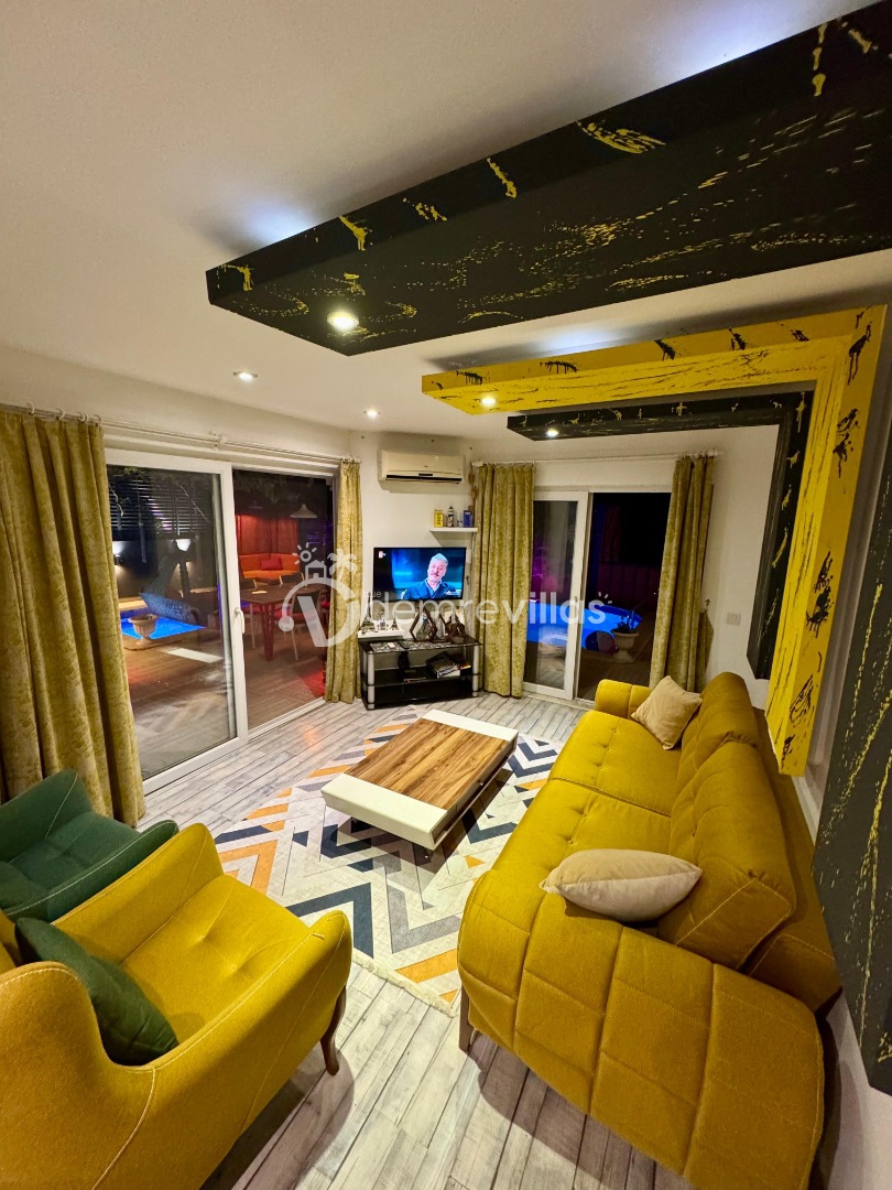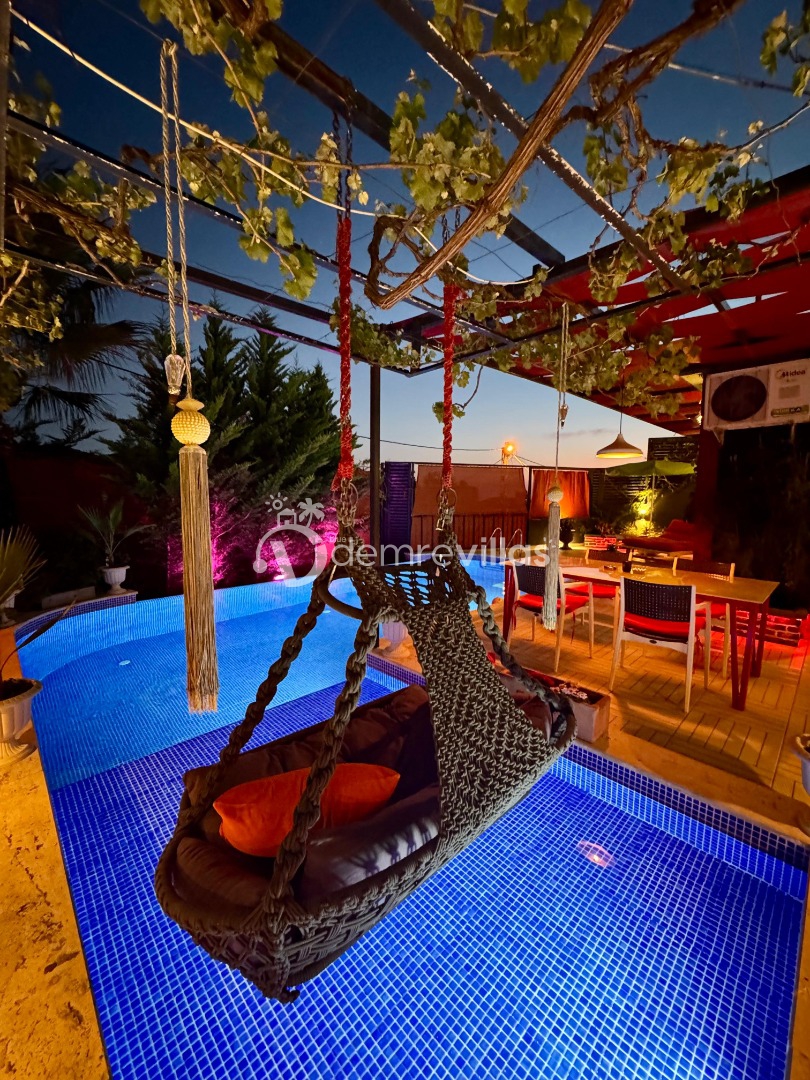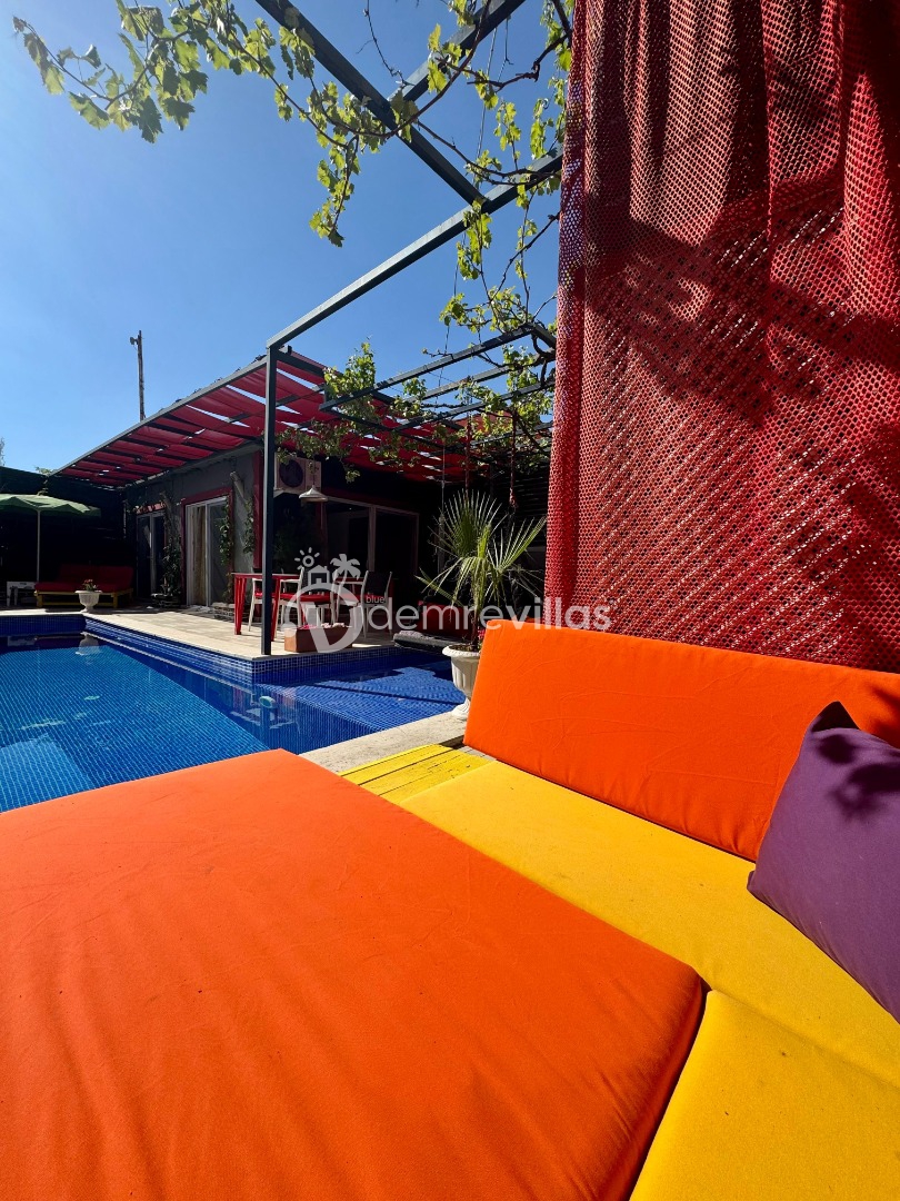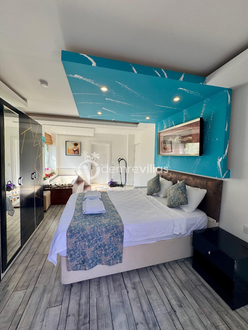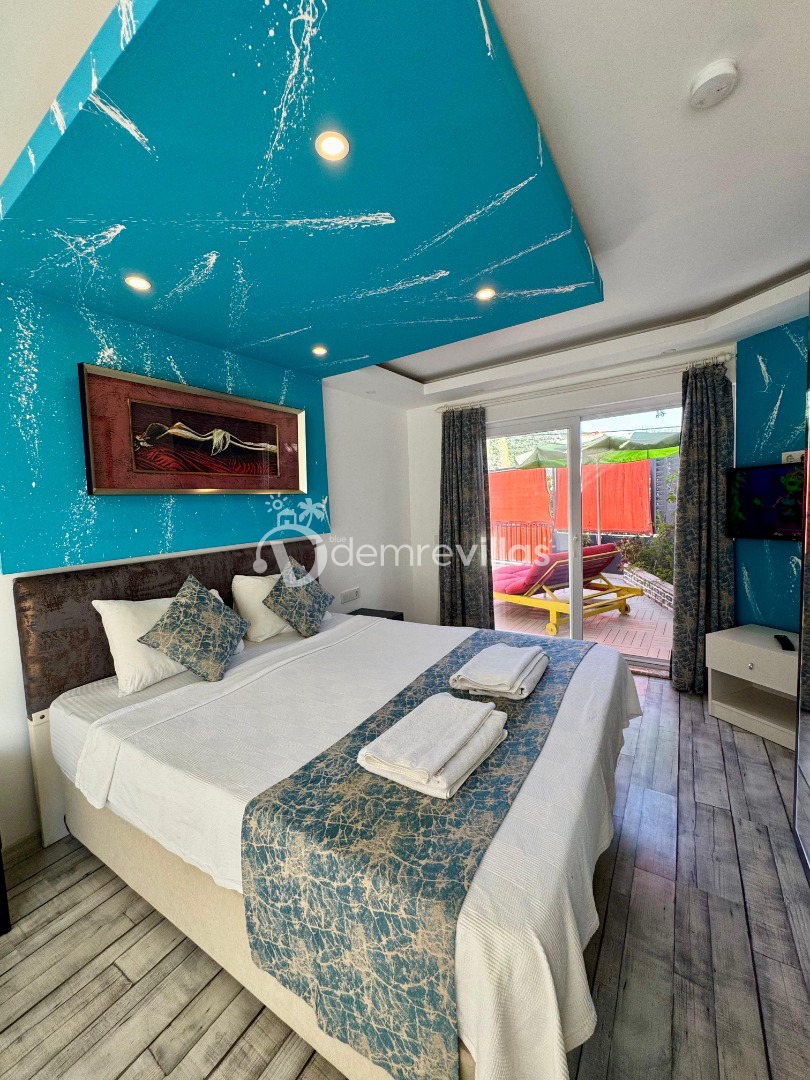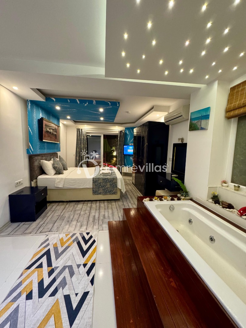 Tek yatak odalı olan villamızın çok güzel bir tasarımı bulunmaktadır. Renkli bir tasarıma sahip evimizin bahçe şemsiyelerle dekore edilmiştir. Özellikle balayı misafirlerimizin ilgisini çekecek villamızın yatak odası içerisinde jakuzi de yer almaktadır.