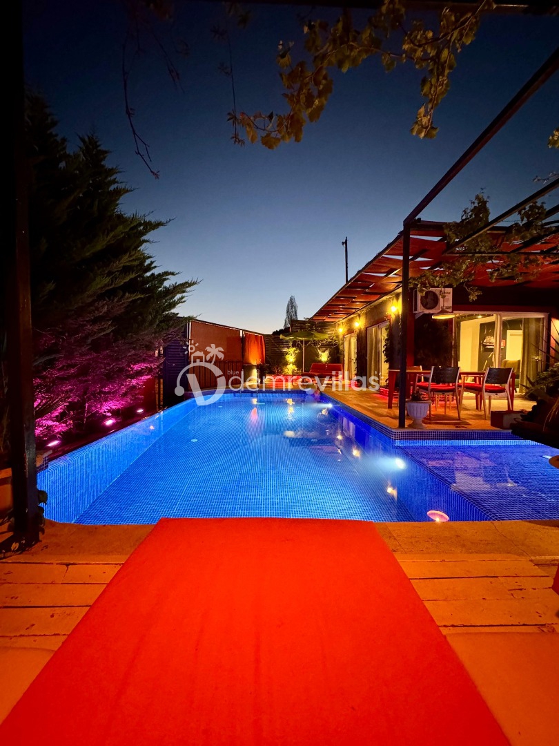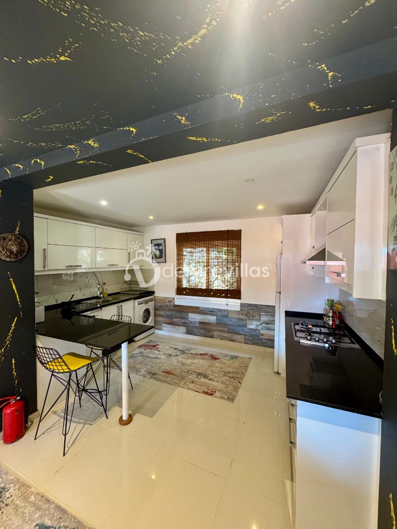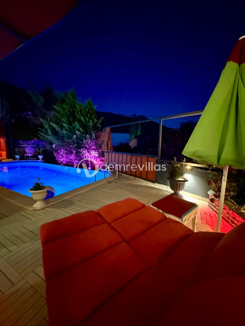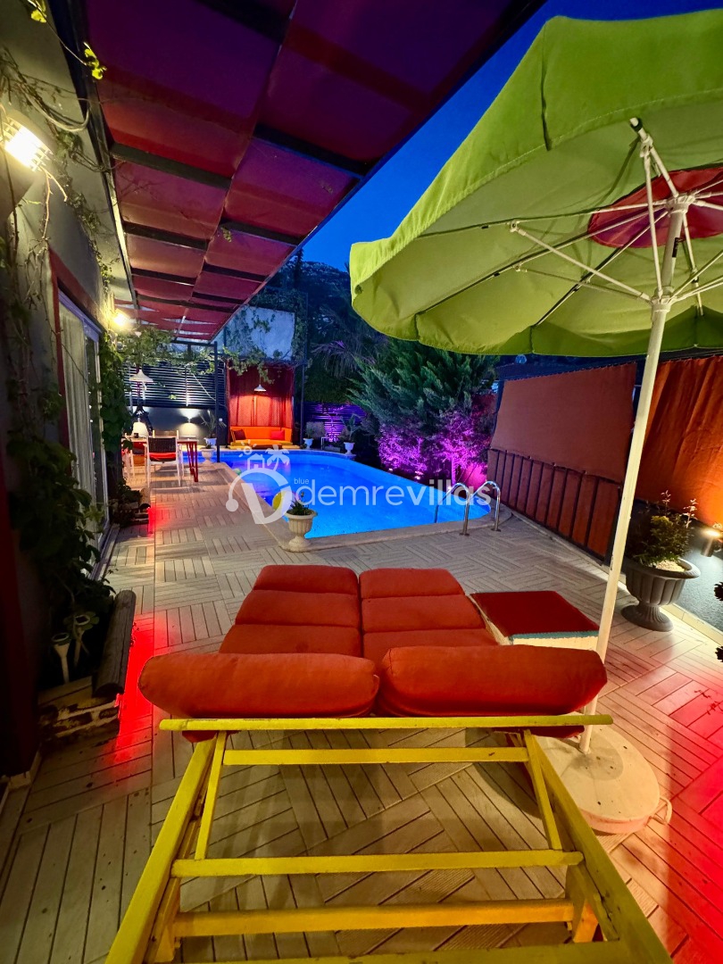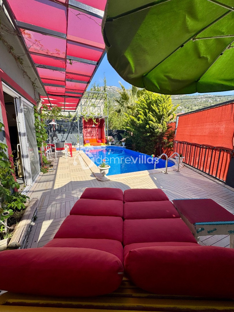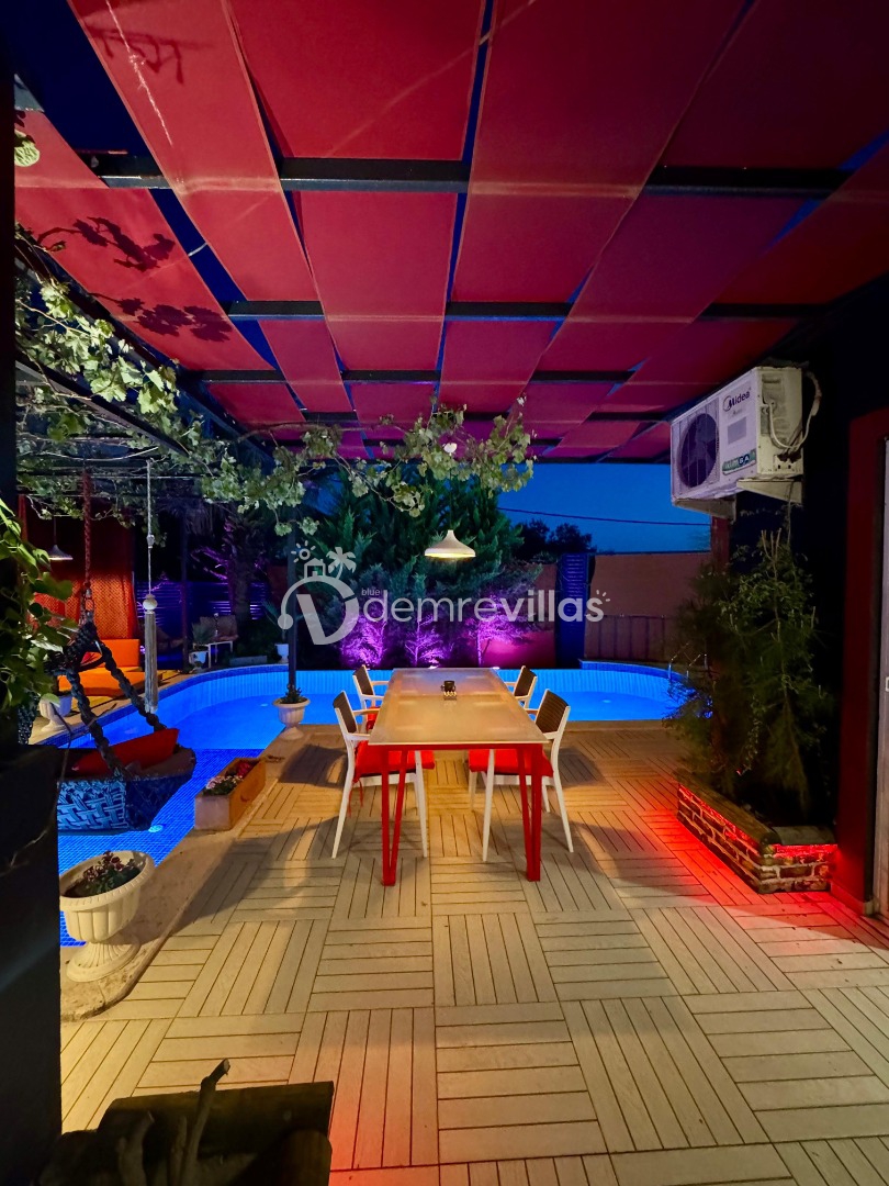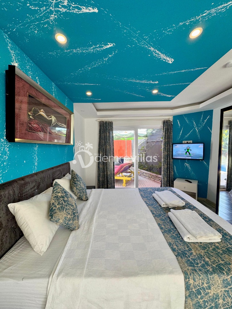 Tek yatak odalı olan villamızın çok güzel bir tasarımı bulunmaktadır. Renkli bir tasarıma sahip evimizin bahçe şemsiyelerle dekore edilmiştir. Özellikle balayı misafirlerimizin ilgisini çekecek villamızın yatak odası içerisinde jakuzi de yer almaktadır.