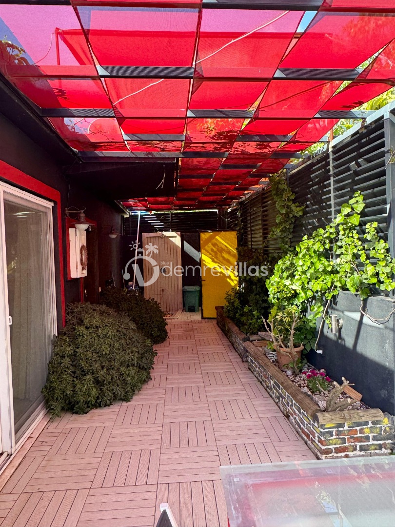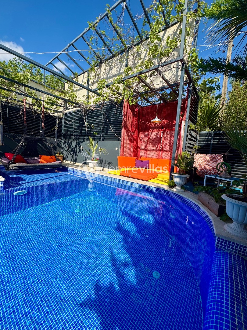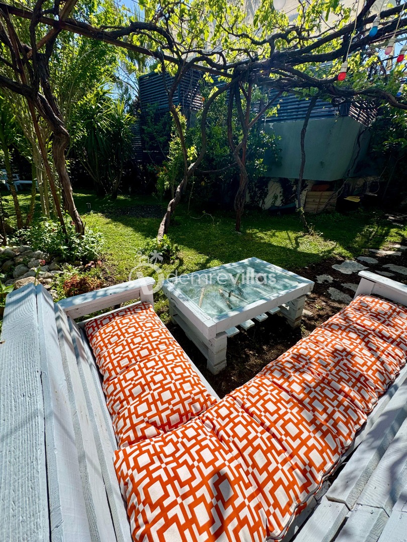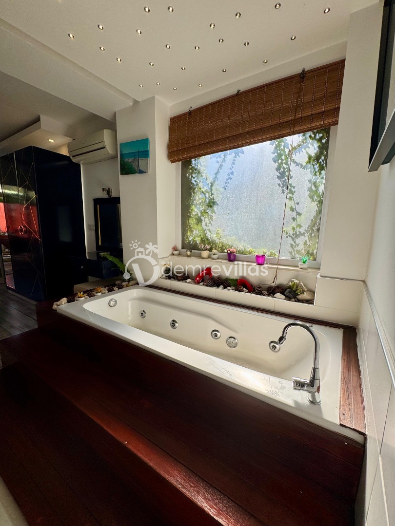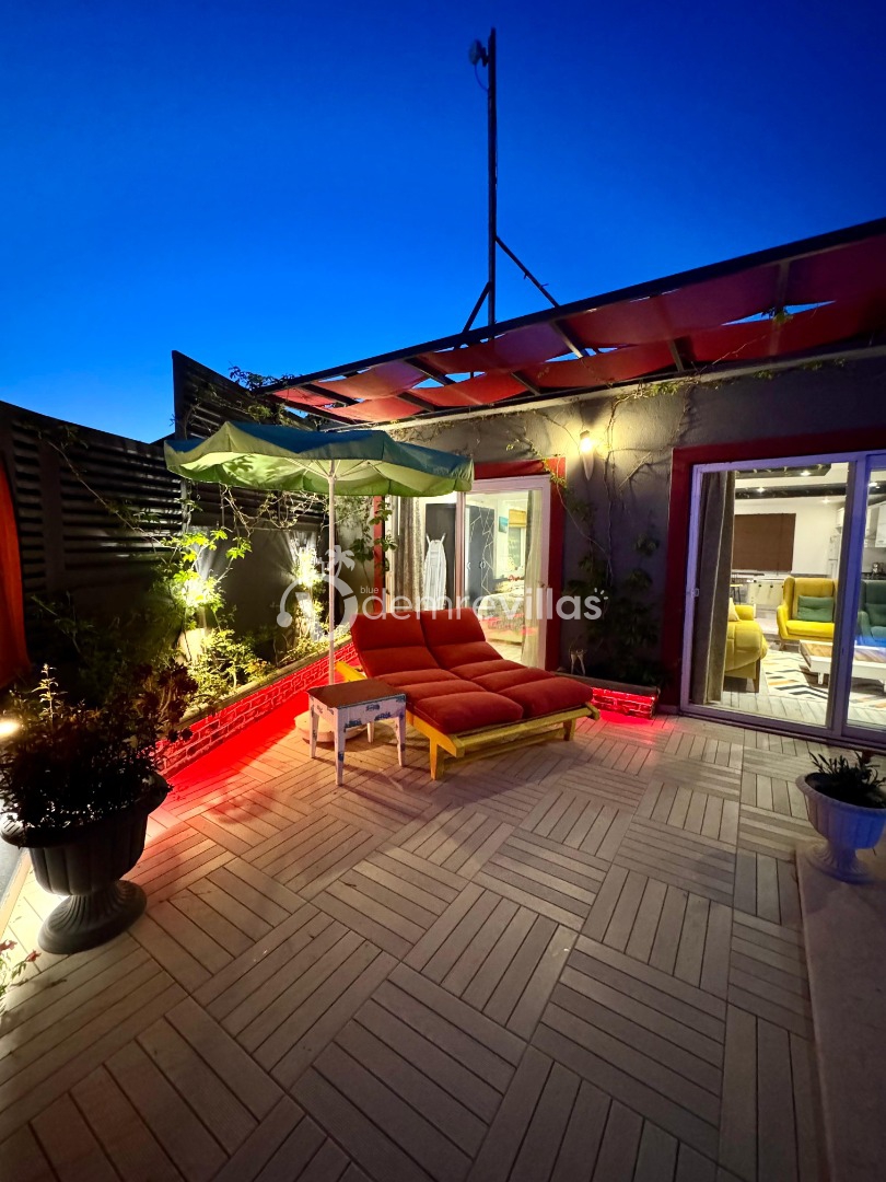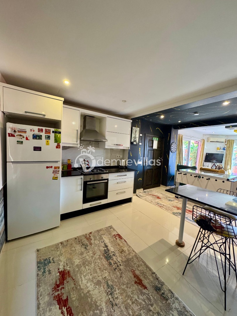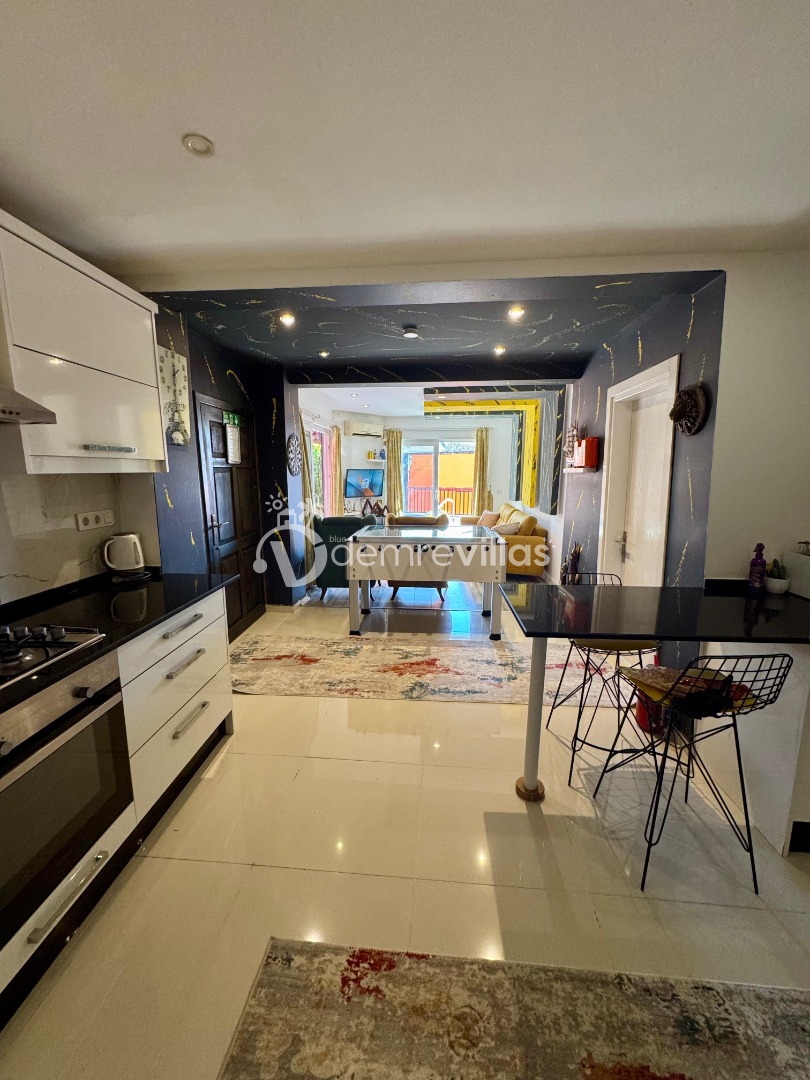 Tek yatak odalı olan villamızın çok güzel bir tasarımı bulunmaktadır. Renkli bir tasarıma sahip evimizin bahçe şemsiyelerle dekore edilmiştir. Özellikle balayı misafirlerimizin ilgisini çekecek villamızın yatak odası içerisinde jakuzi de yer almaktadır.