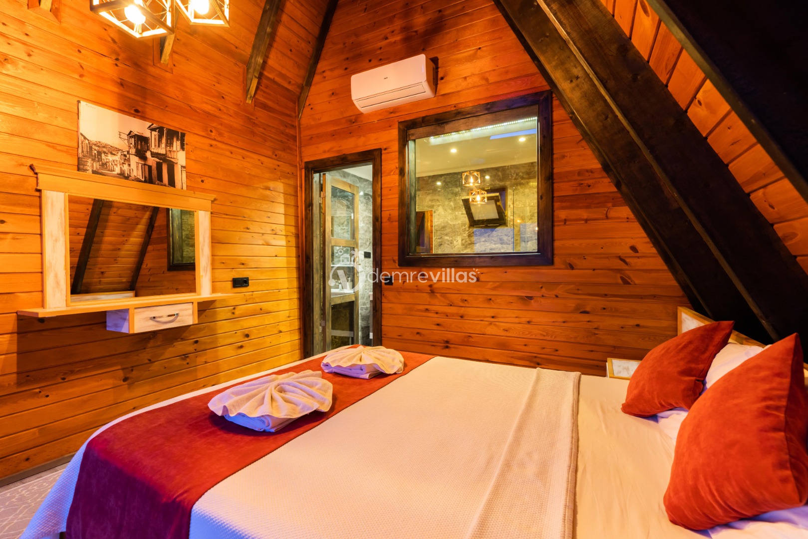 Villa Bungalovumuz muhafazakâr aileler ve balayı çiftleri için özenle dekore edilmiştir. Villamızda tek yatak odası ve jakuzi bulunup 2 kişilik konaklamaya müsaittir. Sessiz sakin ve korunaklı yapısıyla siz değerli misafirlerimize gözlerden uzak, yeşillikler içerisinde tatil yapma imkânı sunmaktadır.