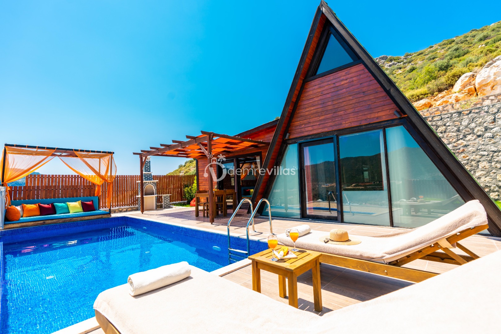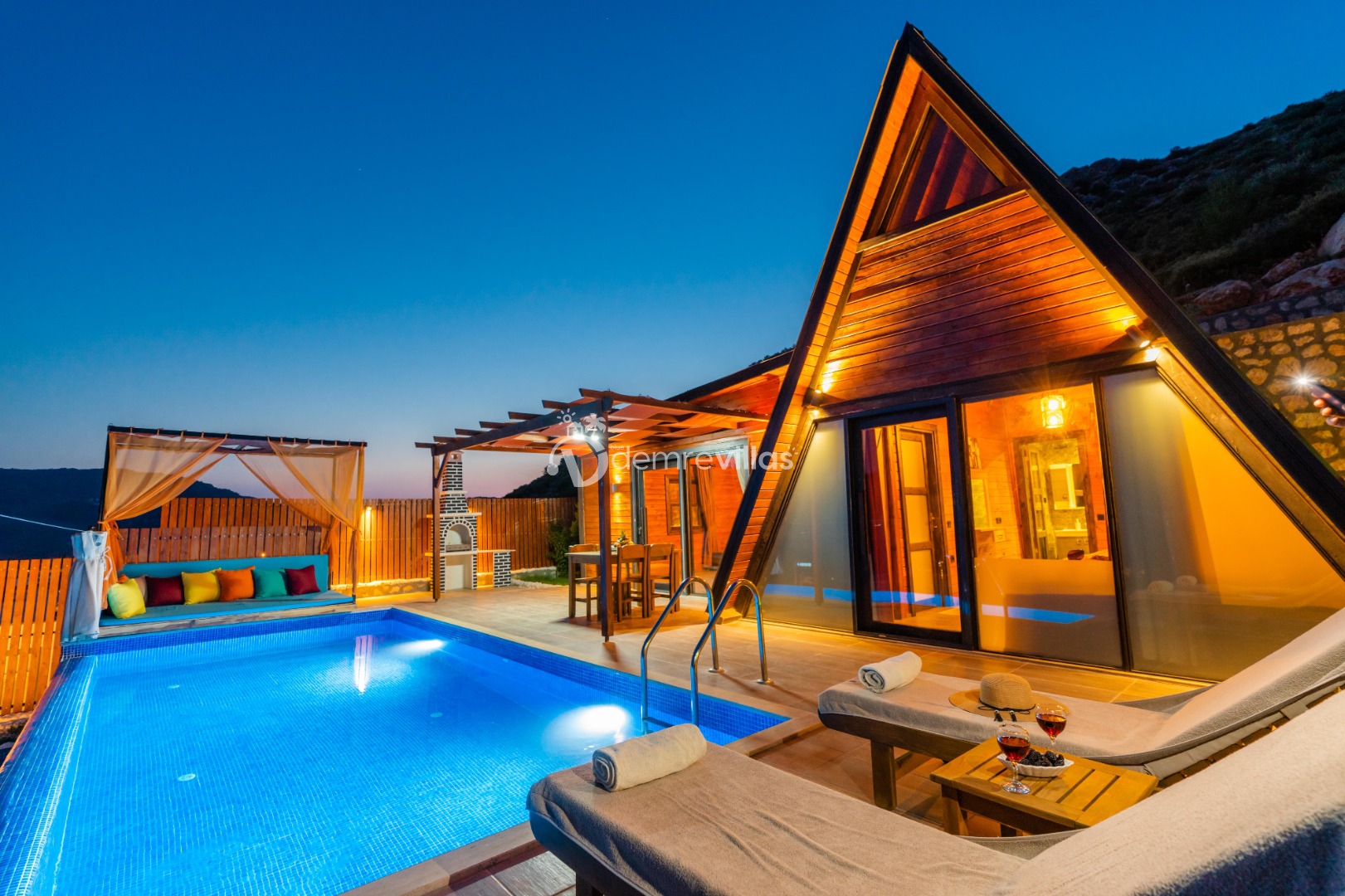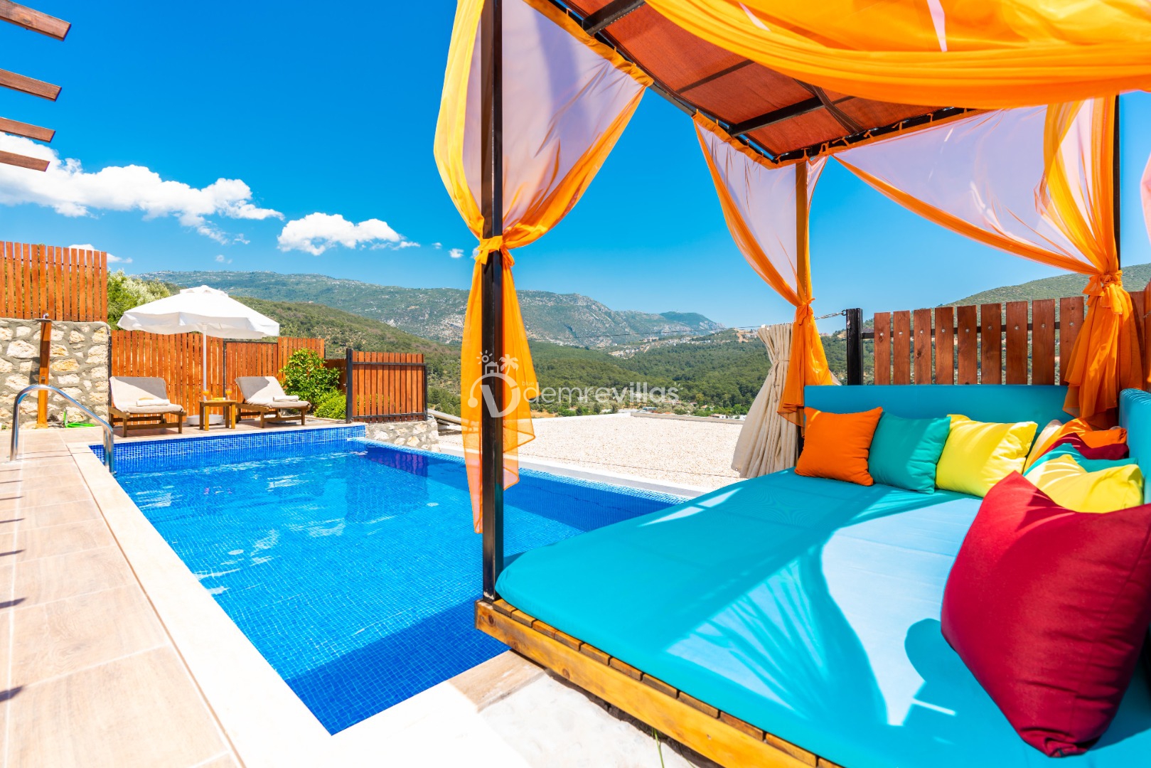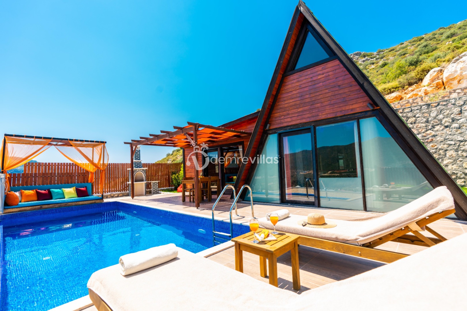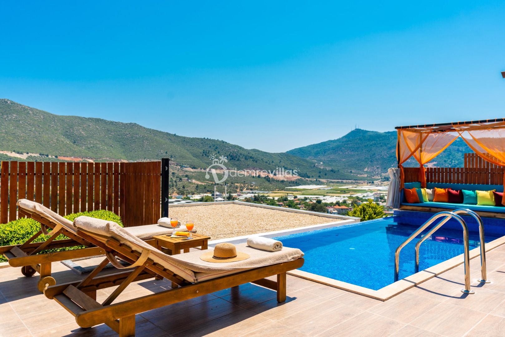 Kalkan, Yeşilköy mevkiinde yer alan özel yüzme alanına sahip, 2 kişi kapasiteli, jakuzili balayı villamızın havuz ve havuz alanı korunaklıdır.