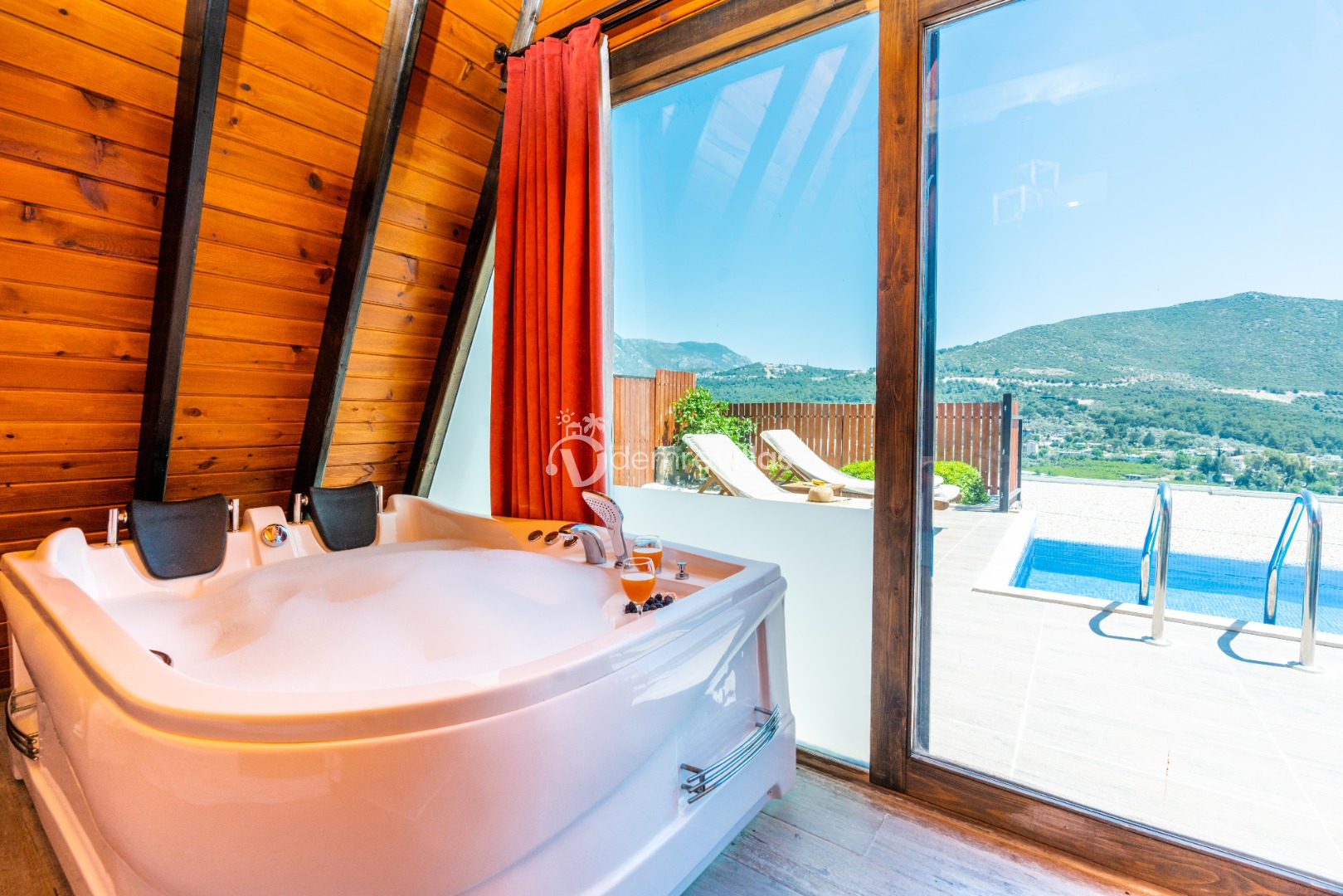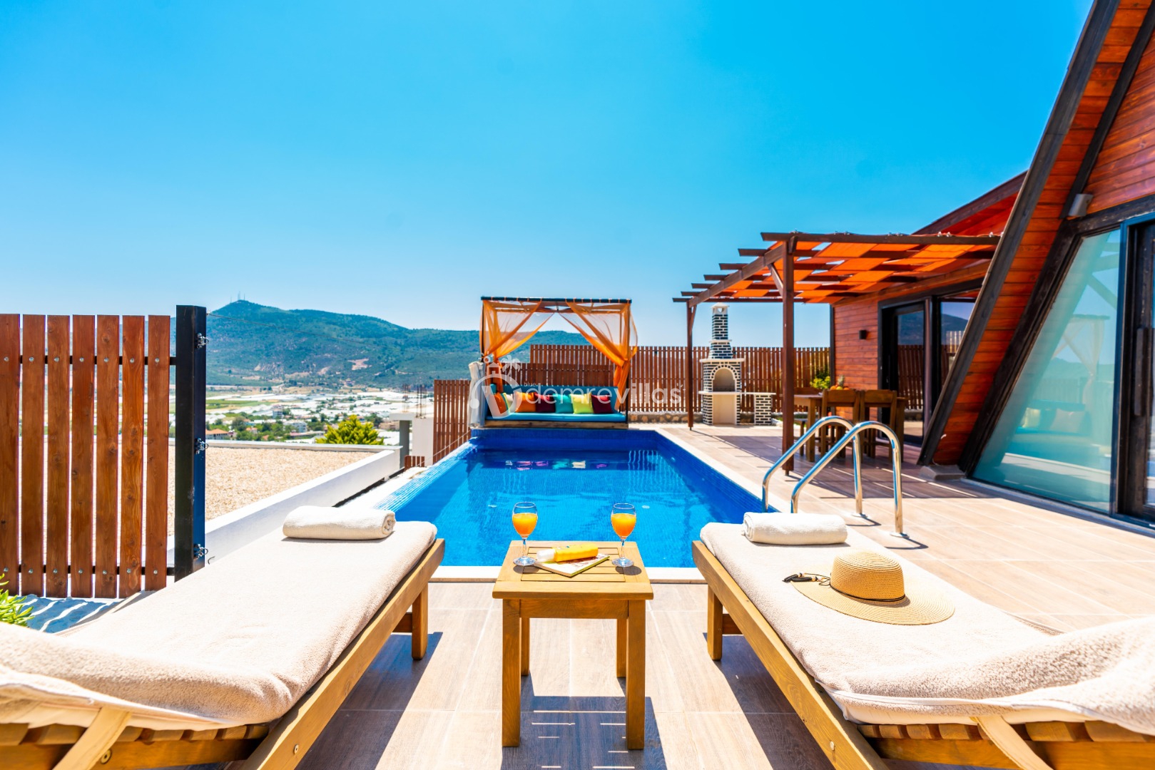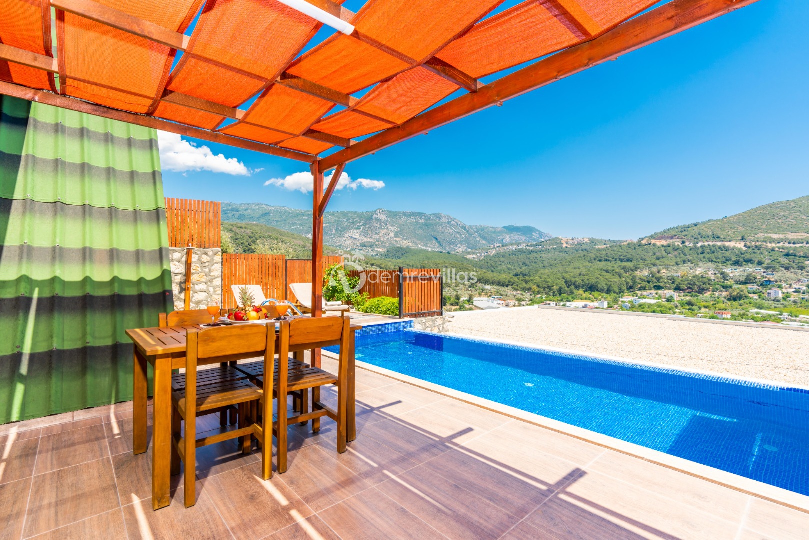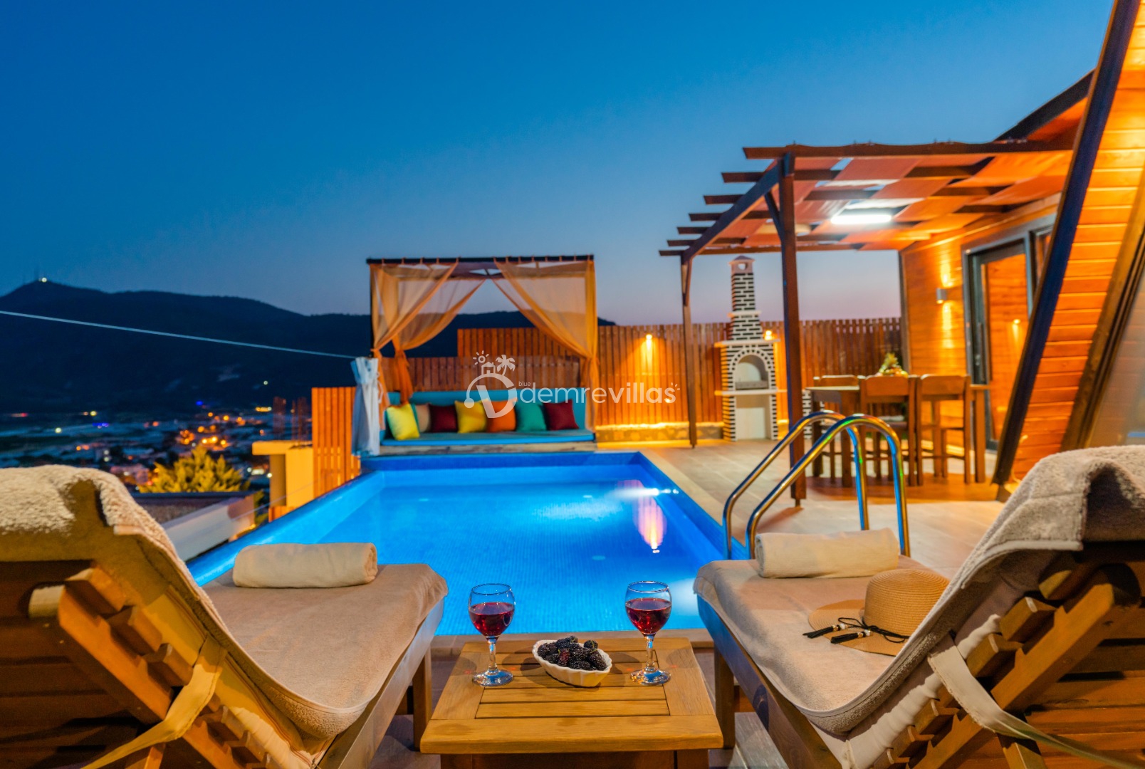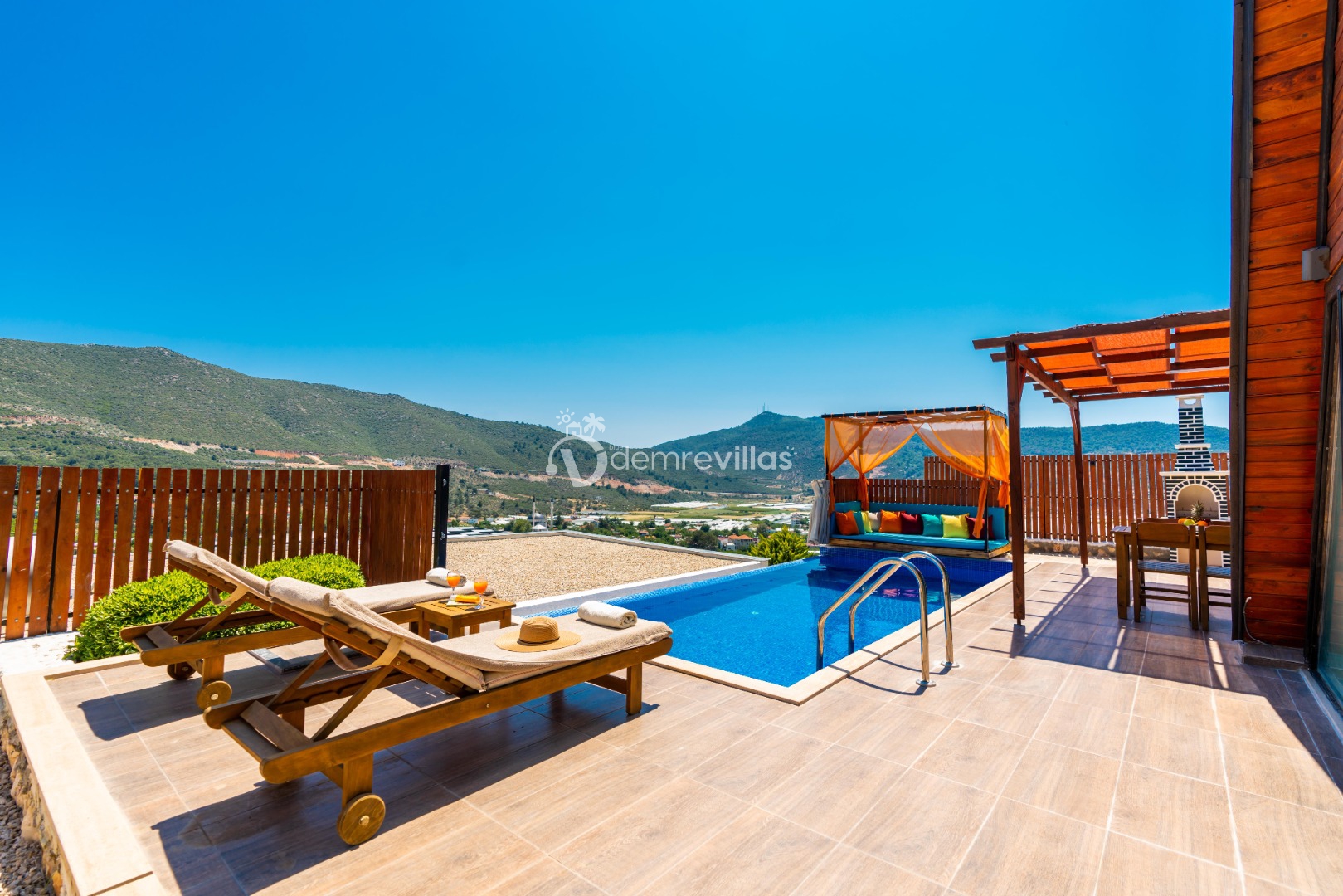 Kalkan, Yeşilköy mevkiinde yer alan özel yüzme alanına sahip, 2 kişi kapasiteli, jakuzili balayı villamızın havuz ve havuz alanı korunaklıdır.