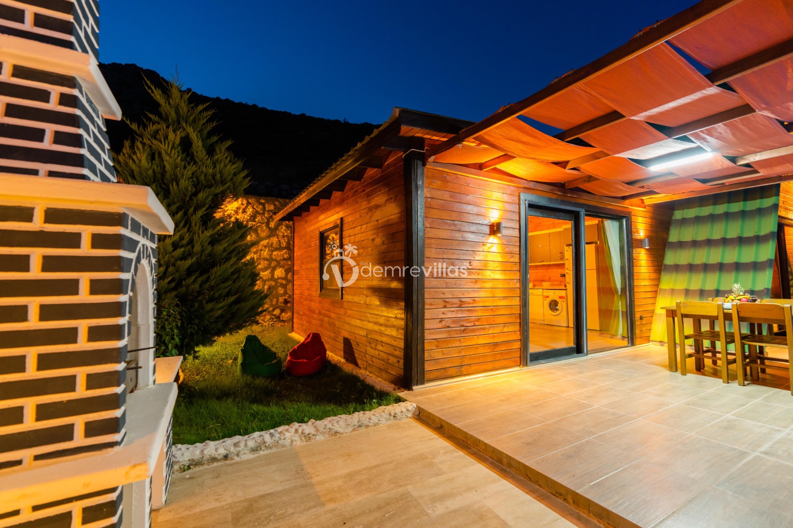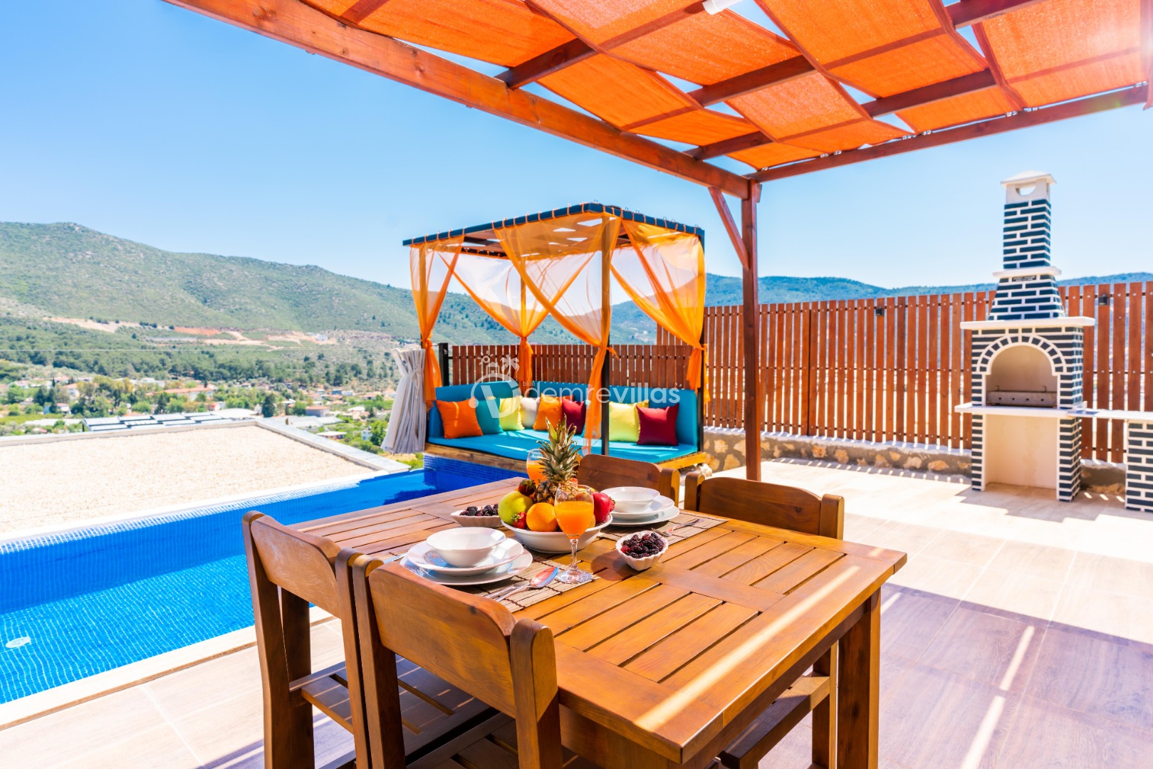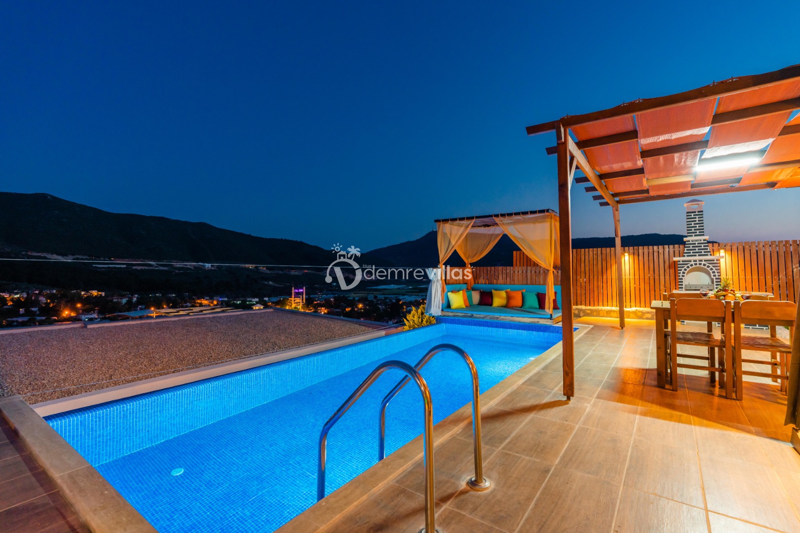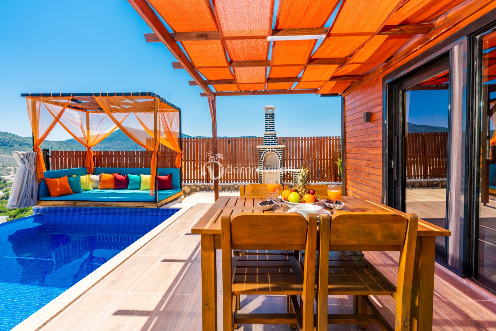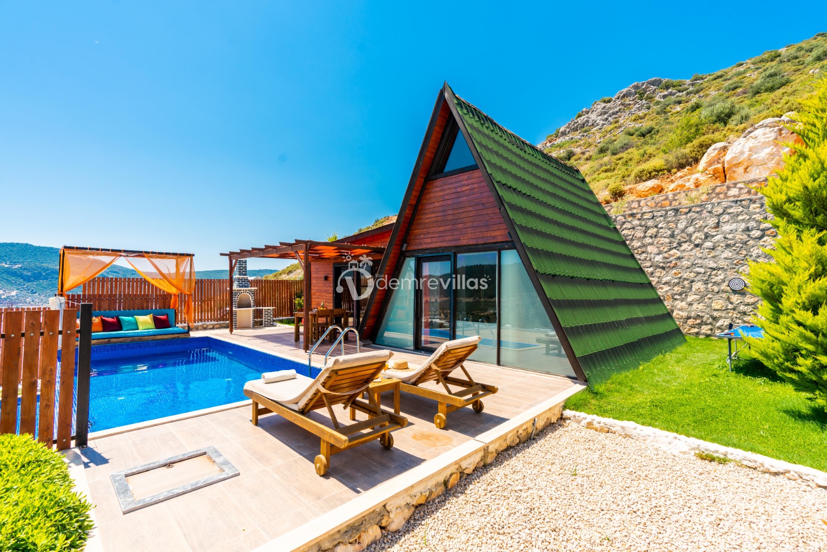 Kalkan, Yeşilköy mevkiinde yer alan özel yüzme alanına sahip, 2 kişi kapasiteli, jakuzili balayı villamızın havuz ve havuz alanı korunaklıdır.