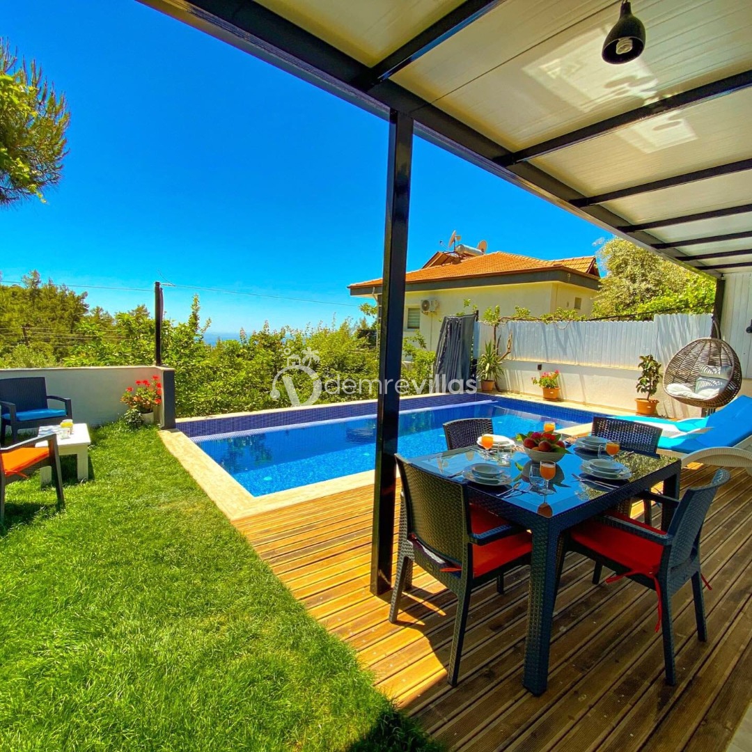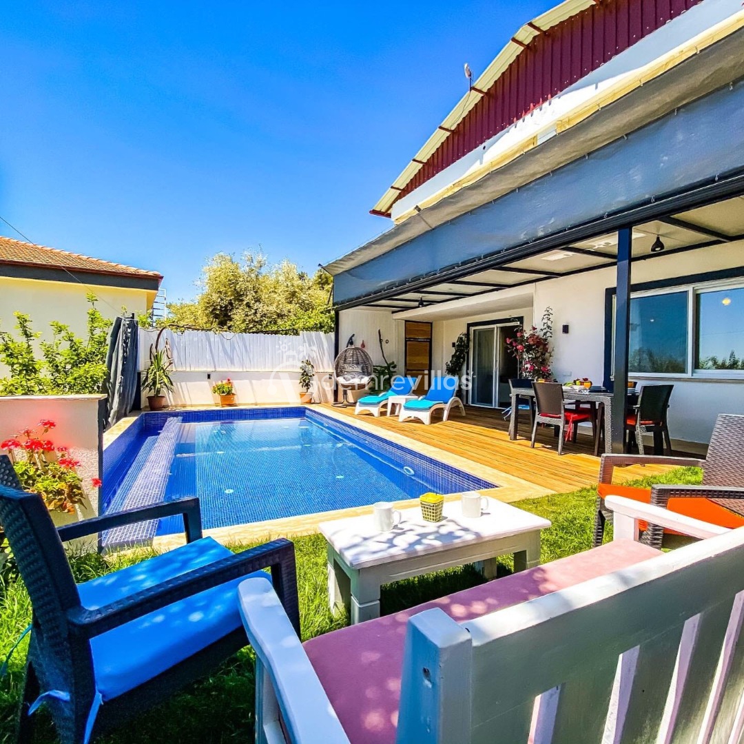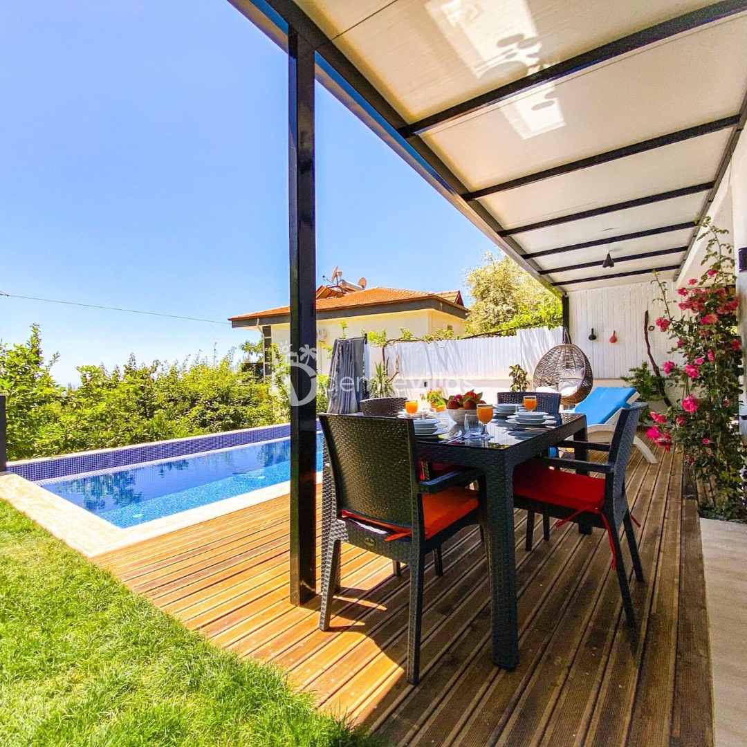 Villa terasında bulunan havuz ve bahçe takımları ile keyifli bir tatil geçirebilirsiniz. Terasımızın çitlerle çevrili olması rahat ve konforlu bir tatil imkanı sunmaktadır. Villamızın içerisi günümüze uygun ve oldukça şık bir şekilde dizayn edilmiştir.