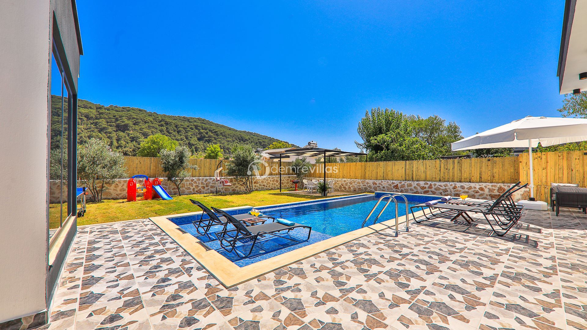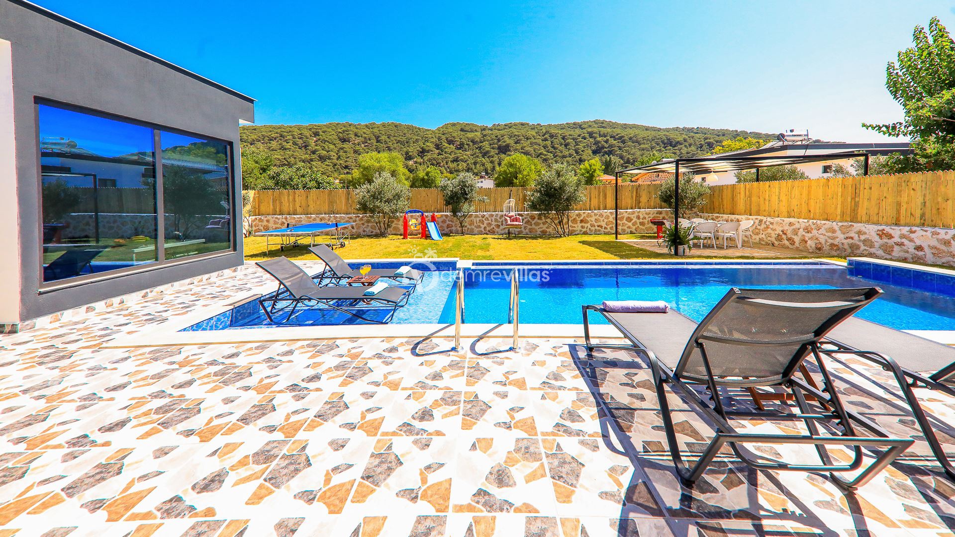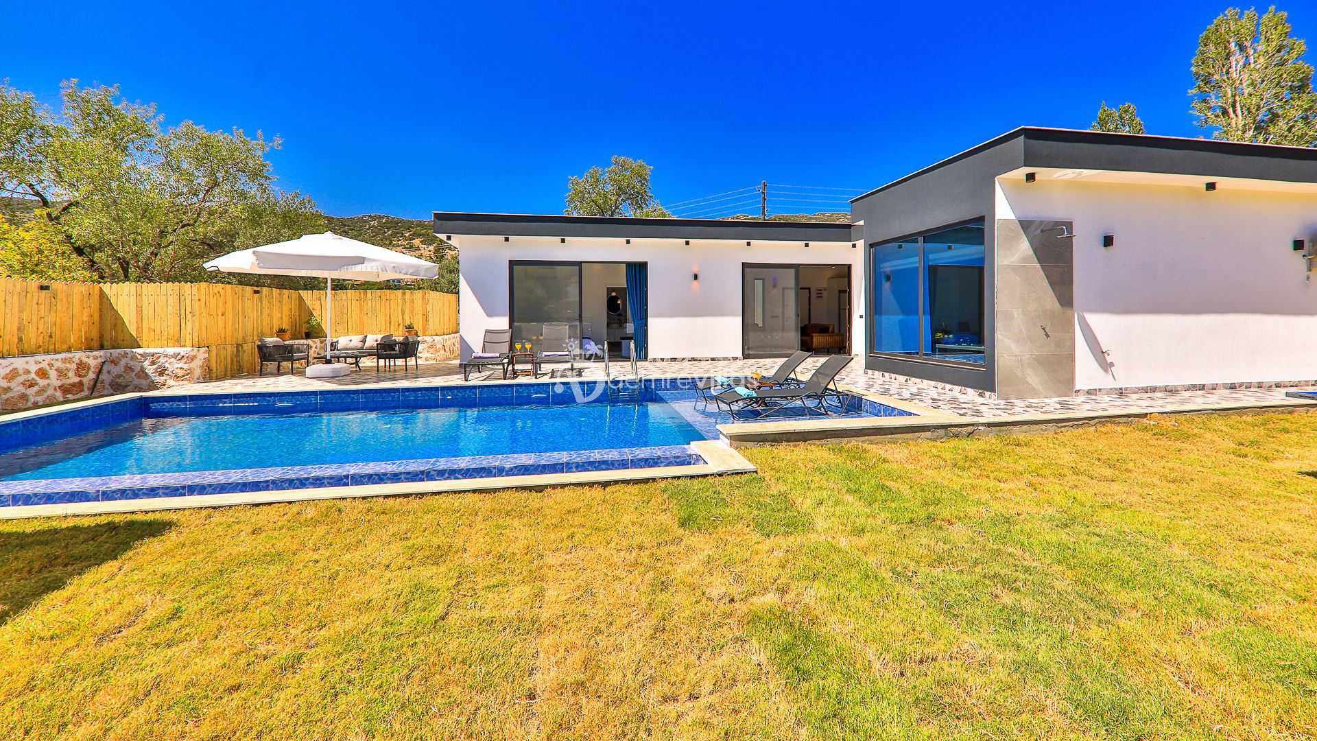 Kiralık Tatil Villamızın havuz ve havuz çevresi korunaklı olup, Muhafazakar tatil arayışında olan değerli misafirlerimiz için ideal eşsiz bir tatil imkanı sunuyor.