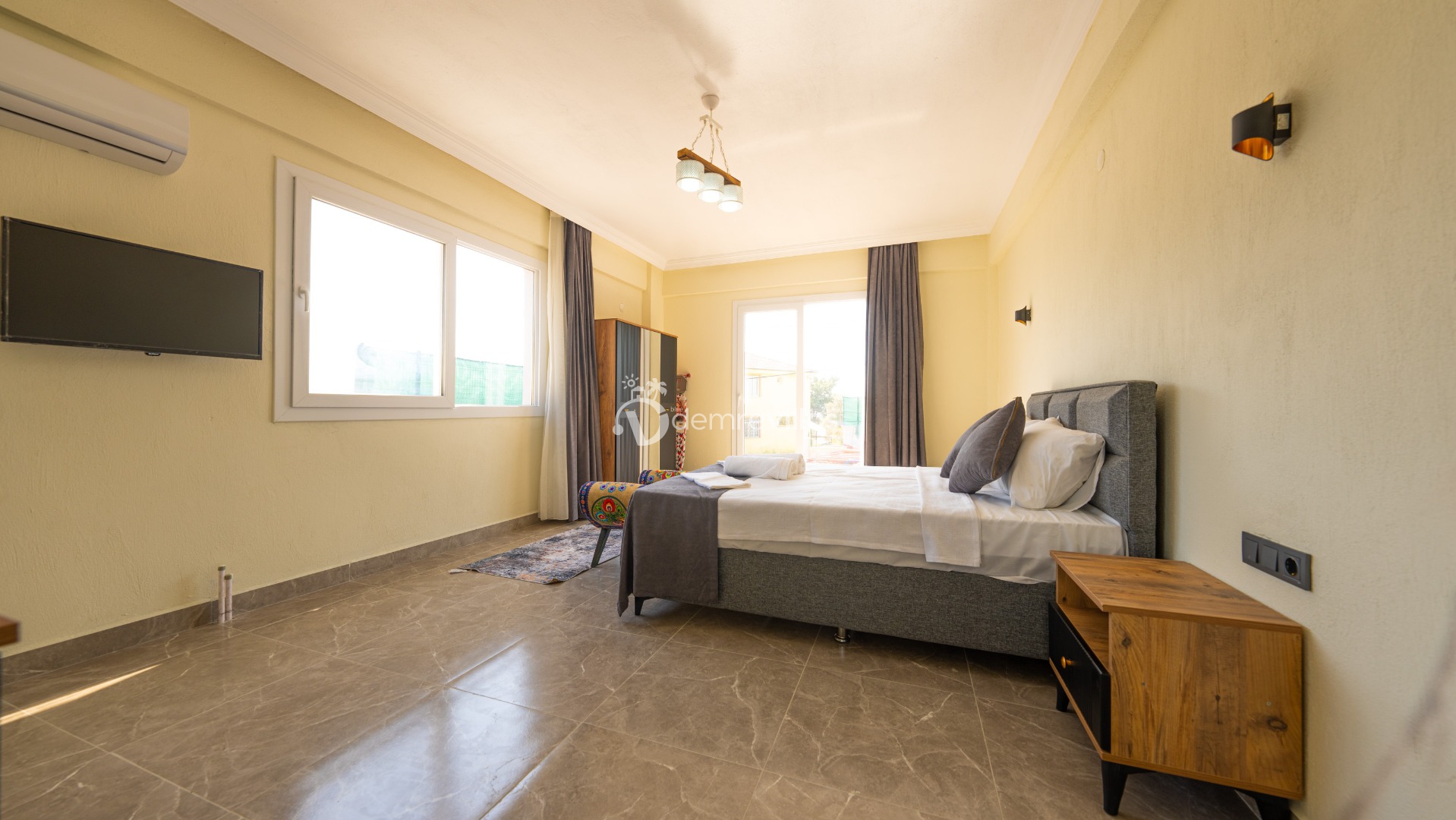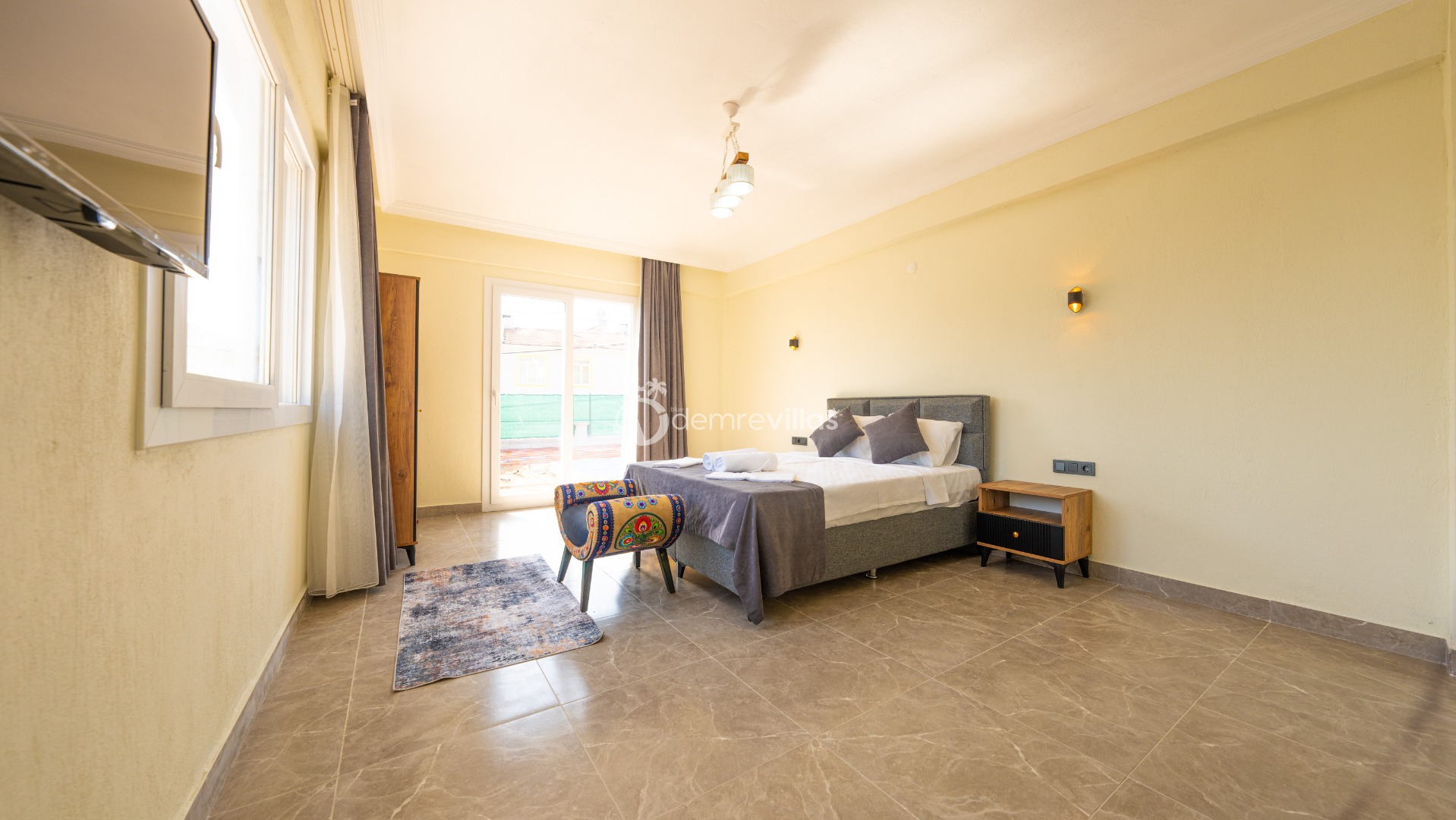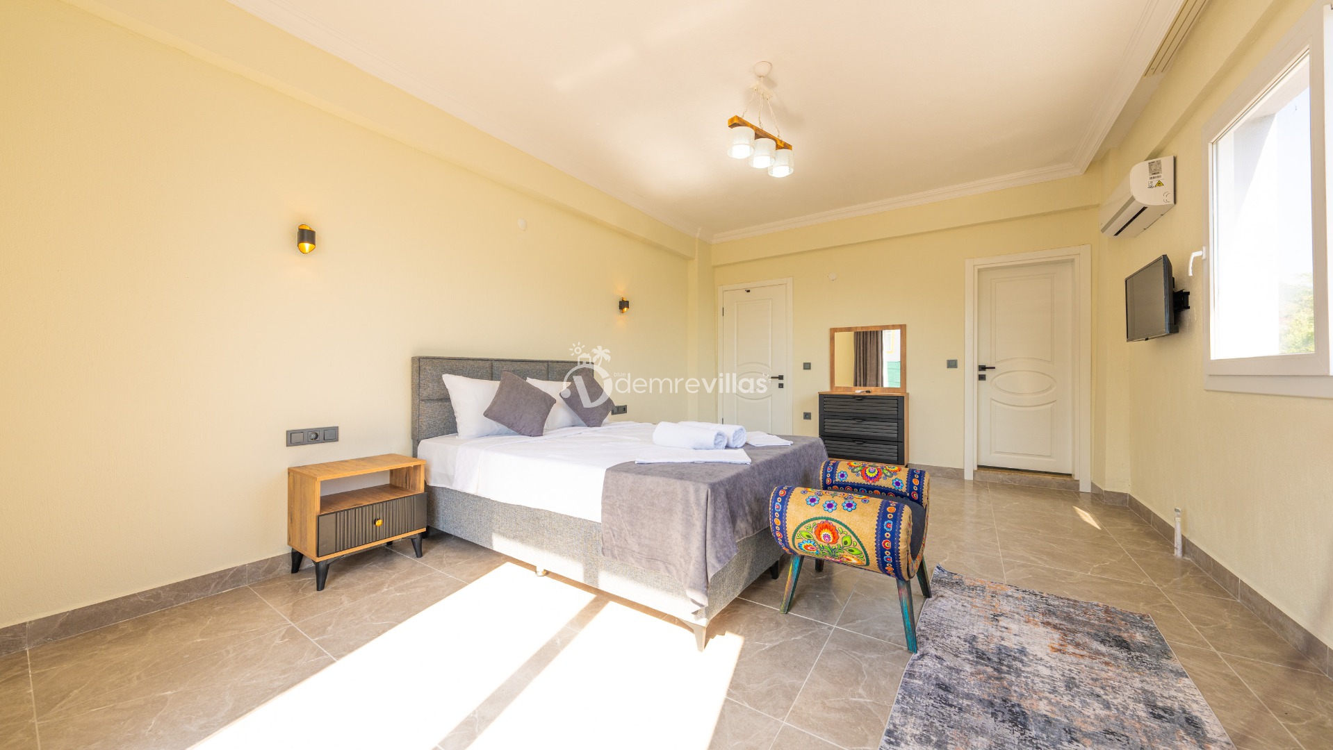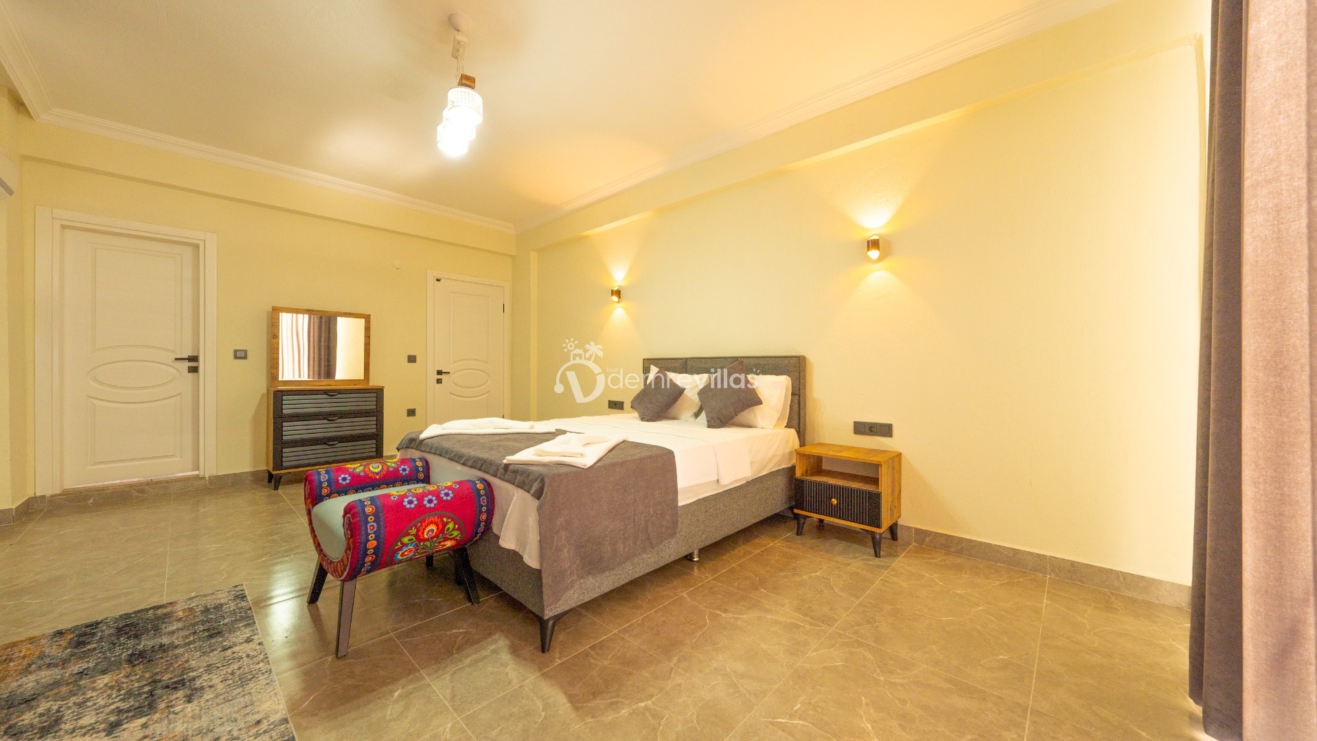 1. Yatak Odası: Çift kişilik yatak, klima, televizyon, komodin, makyaj masası, giysi dolabı, özel banyo ve tuvalet.