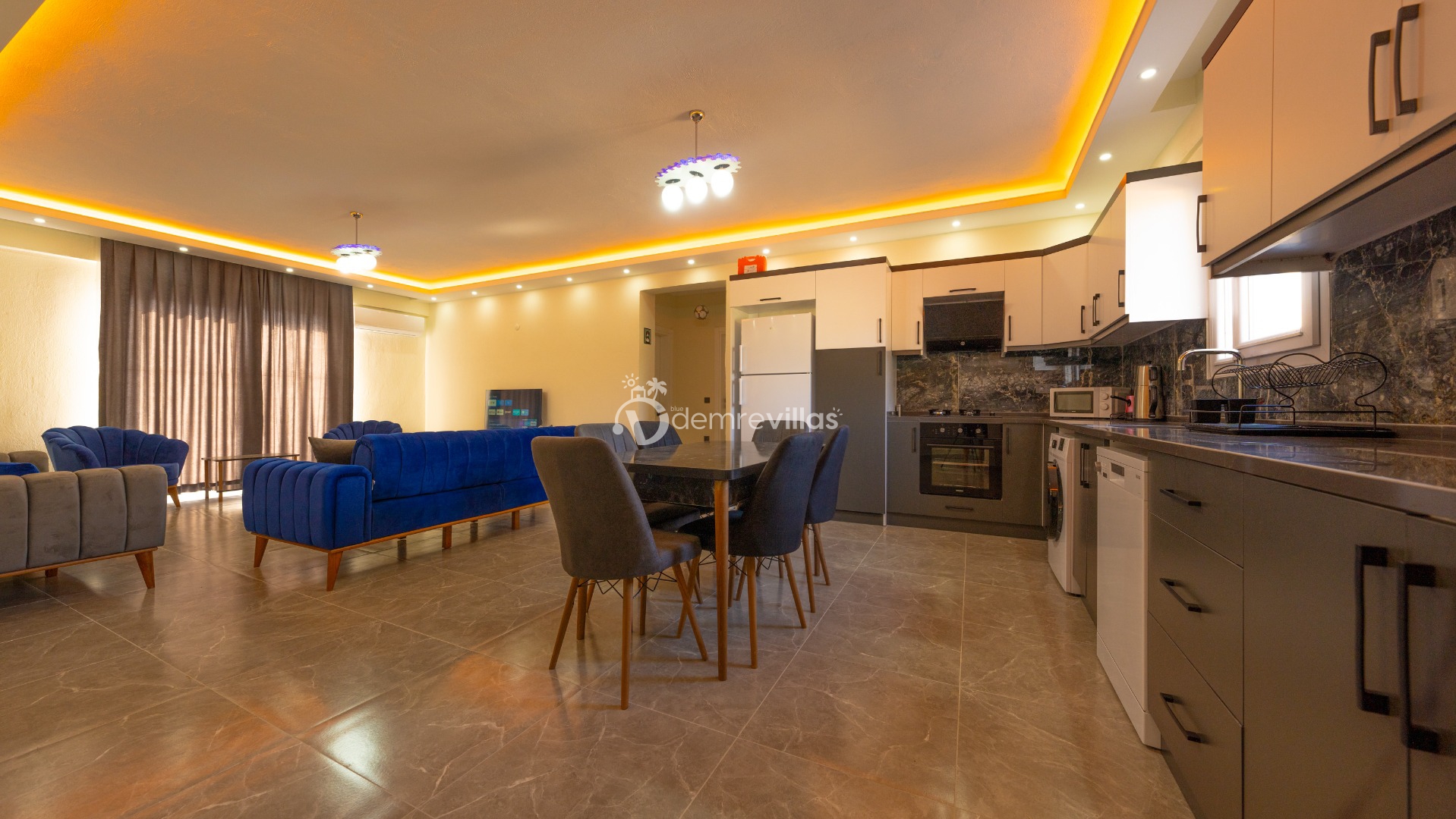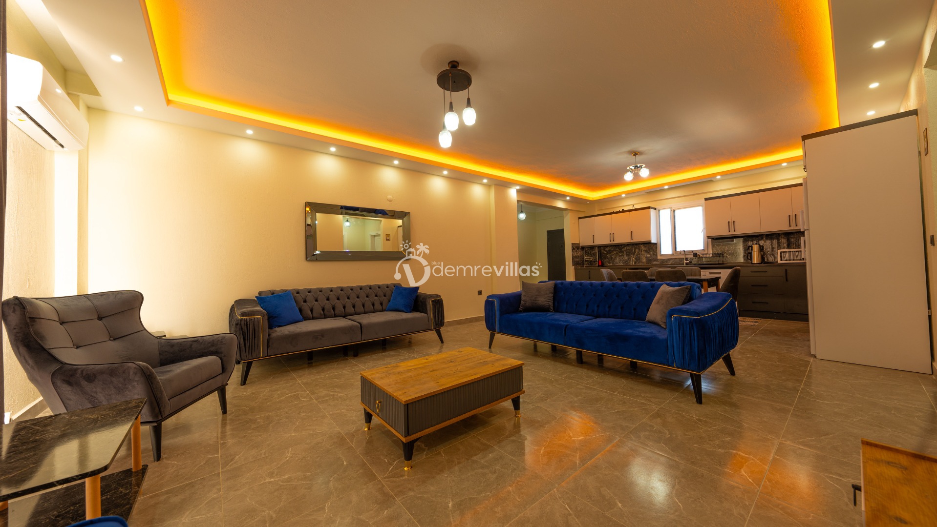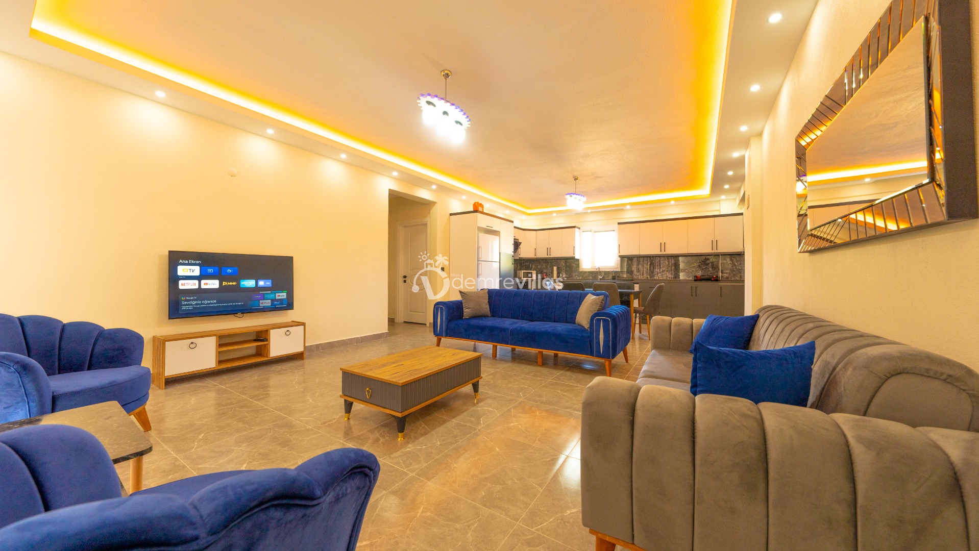 Villamızın salonu oldukça geniş ve ferah olup, misafirlerimize konforlu bir yaşam alanı sunmaktadır. Donanımlı mutfağımızda tost makinesi, su ısıtıcısı, mikrodalga fırın, Türk kahvesi makinesi ve 6 kişilik yemek takımı gibi tüm ihtiyaçlar düşünülerek hazırlanmıştır.