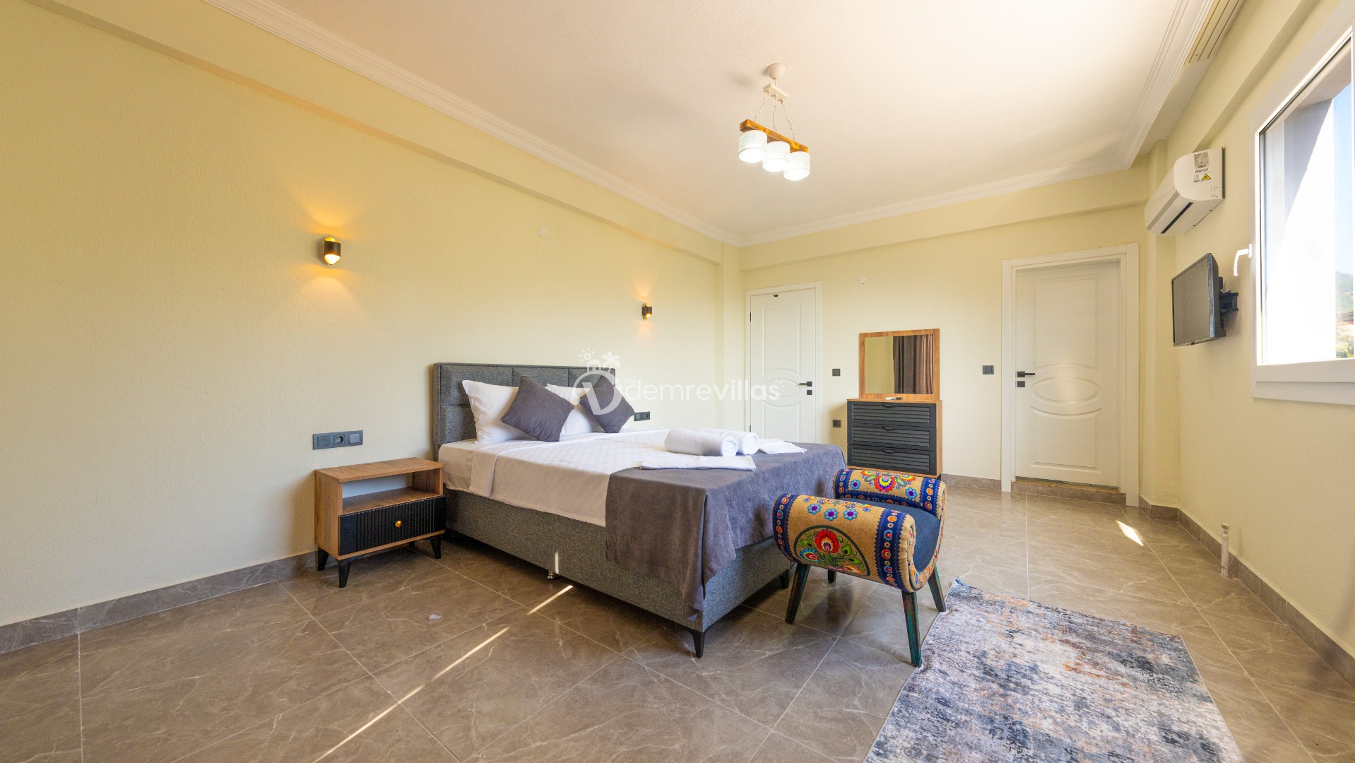 1. Yatak Odası: Çift kişilik yatak, klima, televizyon, komodin, makyaj masası, giysi dolabı, özel banyo ve tuvalet.