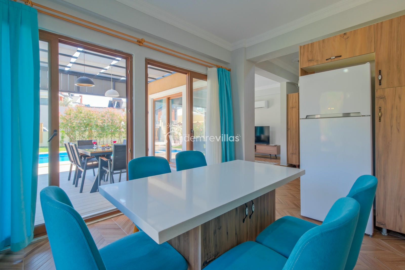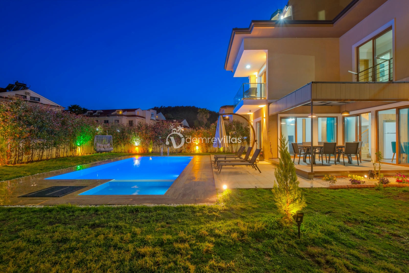 Villamızın özel havuzunda doyasıya yüzebilir ve güneşin keyfini çıkarabilirsiniz. Bahçe alanında kapasiteye uygun şezlong takımı, oturma grubu, bluetooth ses sistemi, masa tenisi ve barbekü bulunmaktadır. Havuz terasına açılan konforlu oturma odası ve tam donanımlı açık mutfak, tatilinizi daha da keyifli hale getirecek. Villamızın birinci yatak odasında çift kişilik yatak, ebeveyn banyosu; ikinci yatak odasında çift kişilik yatak, üçüncü yatak odasında ise iki adet tek kişilik yatak ve banyo yer almaktadır.