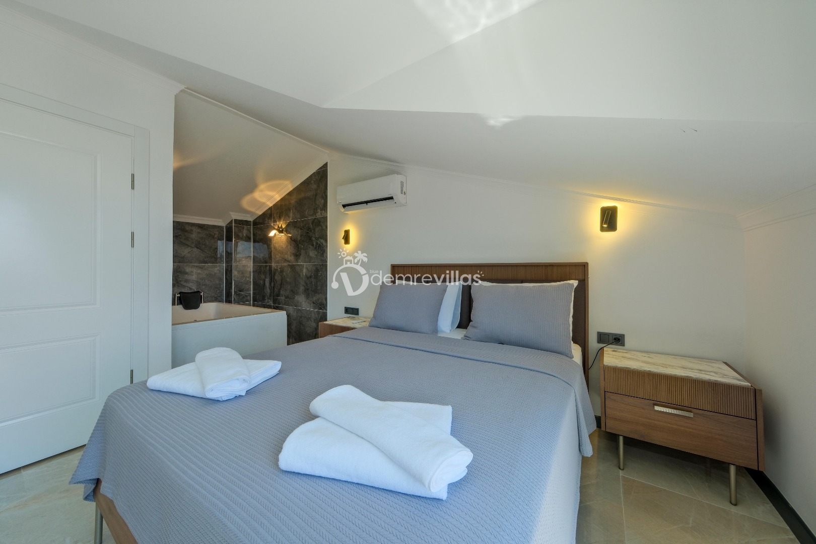1. Yatak Odası : Oda içerisinde 1 adet çift kişilik yatak, komodin, klima, jakuzi ve banyo/WC yer almaktadır.