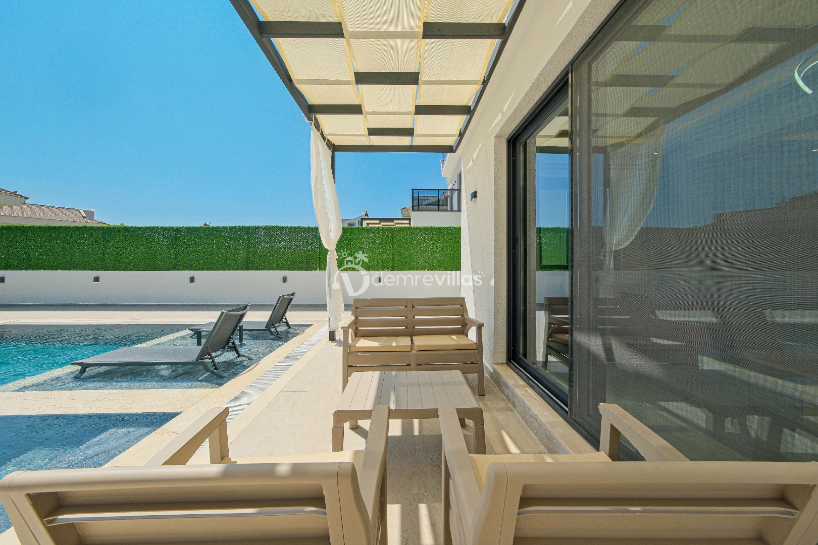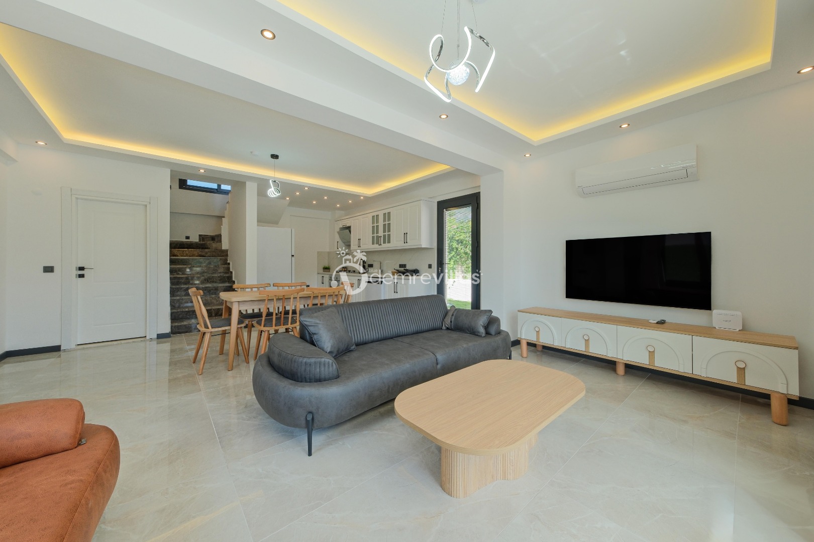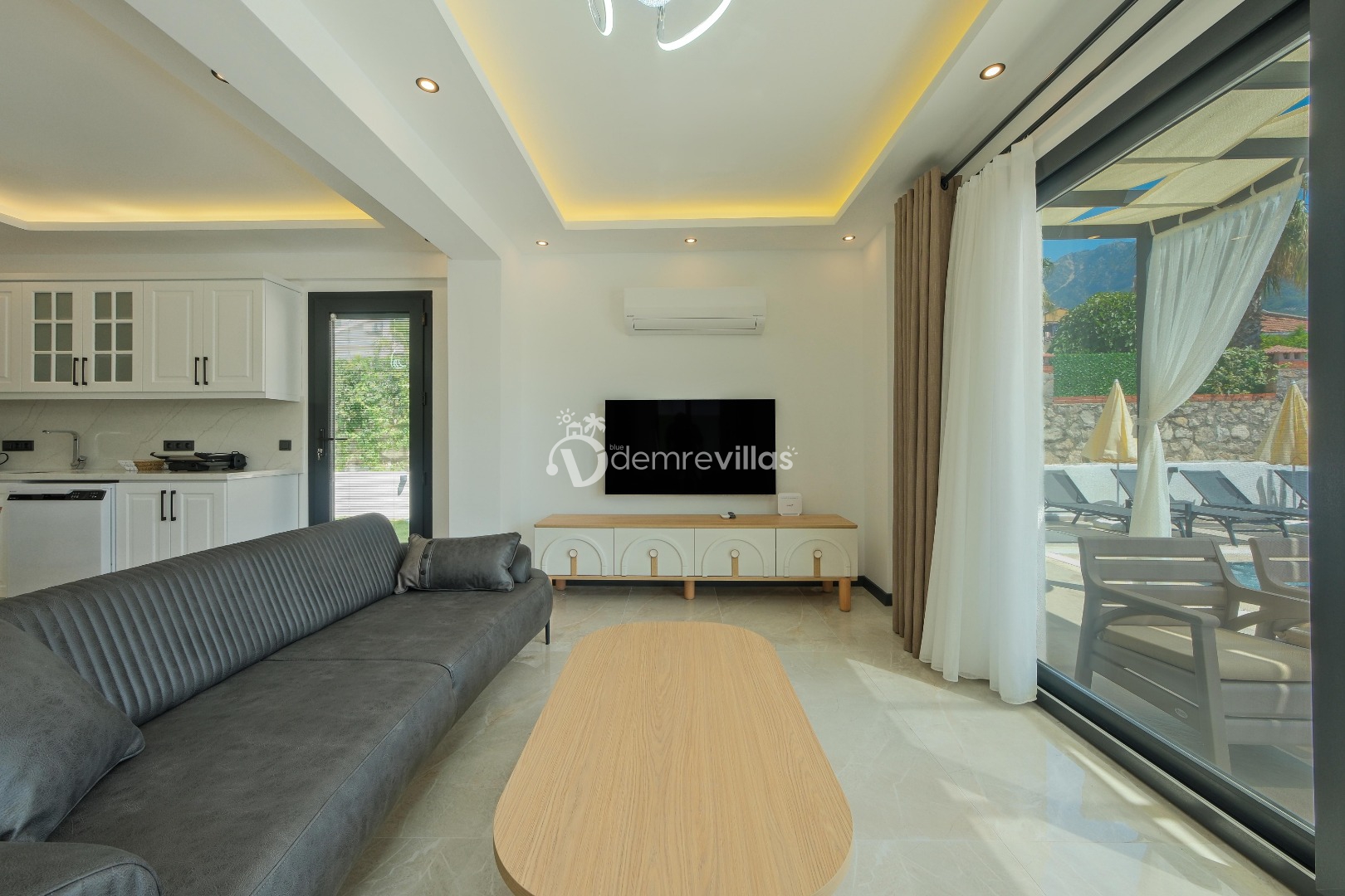 Salon : Salon içerisinde şık bir oturma grubu, orta sehpa, TV, klima, 6 kişilik yemek masası, sandalyeler ve havuz terasına çıkış bulunmaktadır.