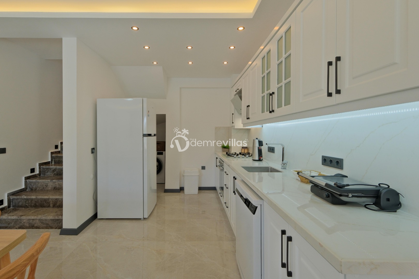 Mutfak : Modern Amerikan mutfak içerisinde buzdolabı, bulaşık makinesi, çamaşır makinesi, fırın, 4’lü ocak seti, tost makinesi, çay makinesi, 6 kişilik temek takımı, mutfak araç gereçler(tabak&bardaklar, tencere&tavalar vb.) bulunmaktadır.