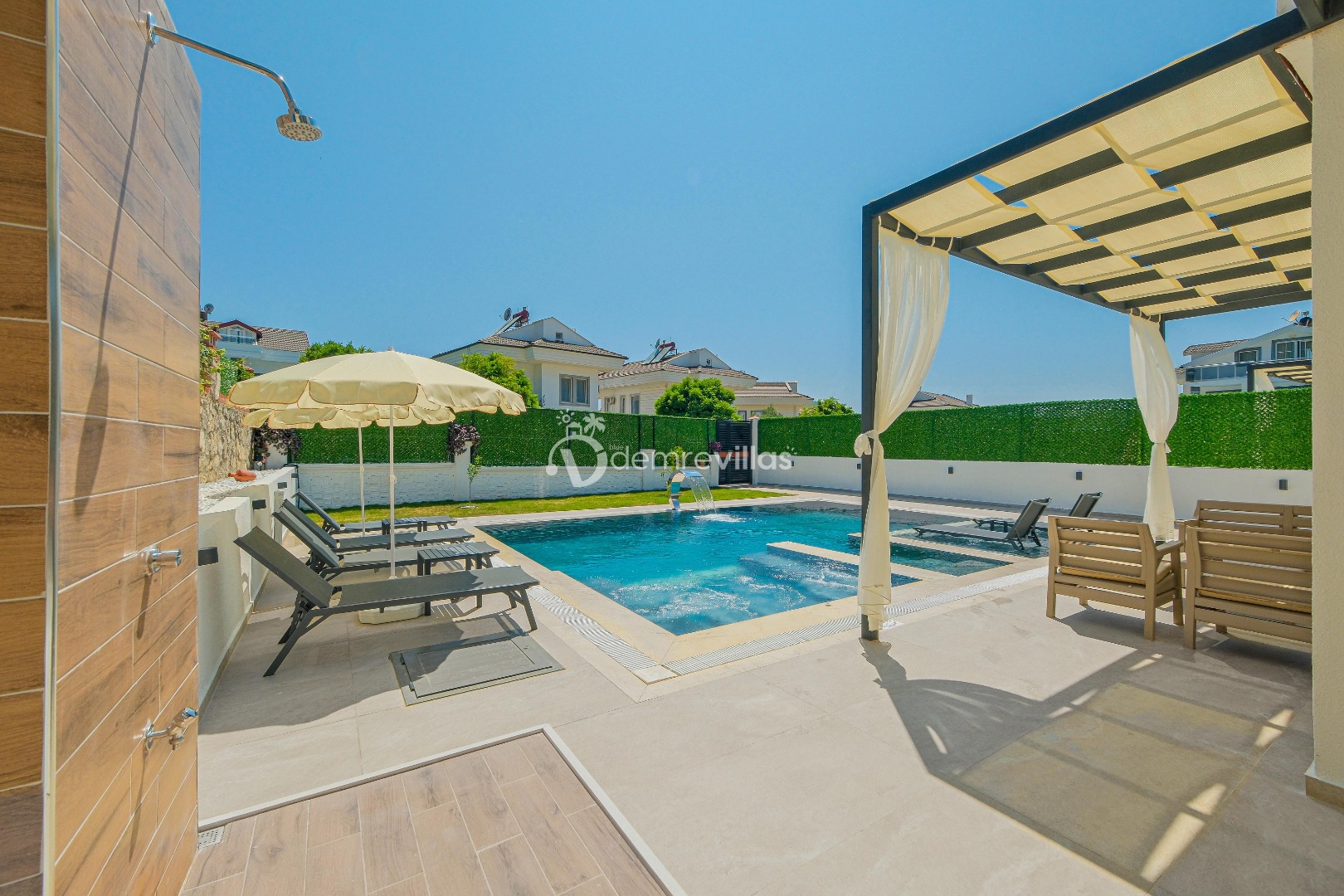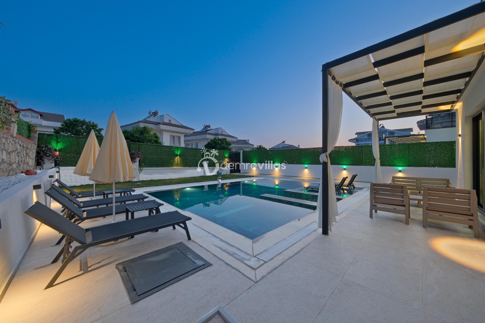 Havuz : Özel bahçe içerisinde, ebatları; 8 x 4 metre ve derinliği 1.50 metre olmak üzere özel yüzme havuzu bulunmaktadır. Ayrıca ana havuza entegre 4x2 jakuzili havuz ve 4x2 sığ havuz mevcuttur. Havuz ve bahçe ve havuz bakımı her gün 1 defa sabah veya akşam yapılmaktadır.