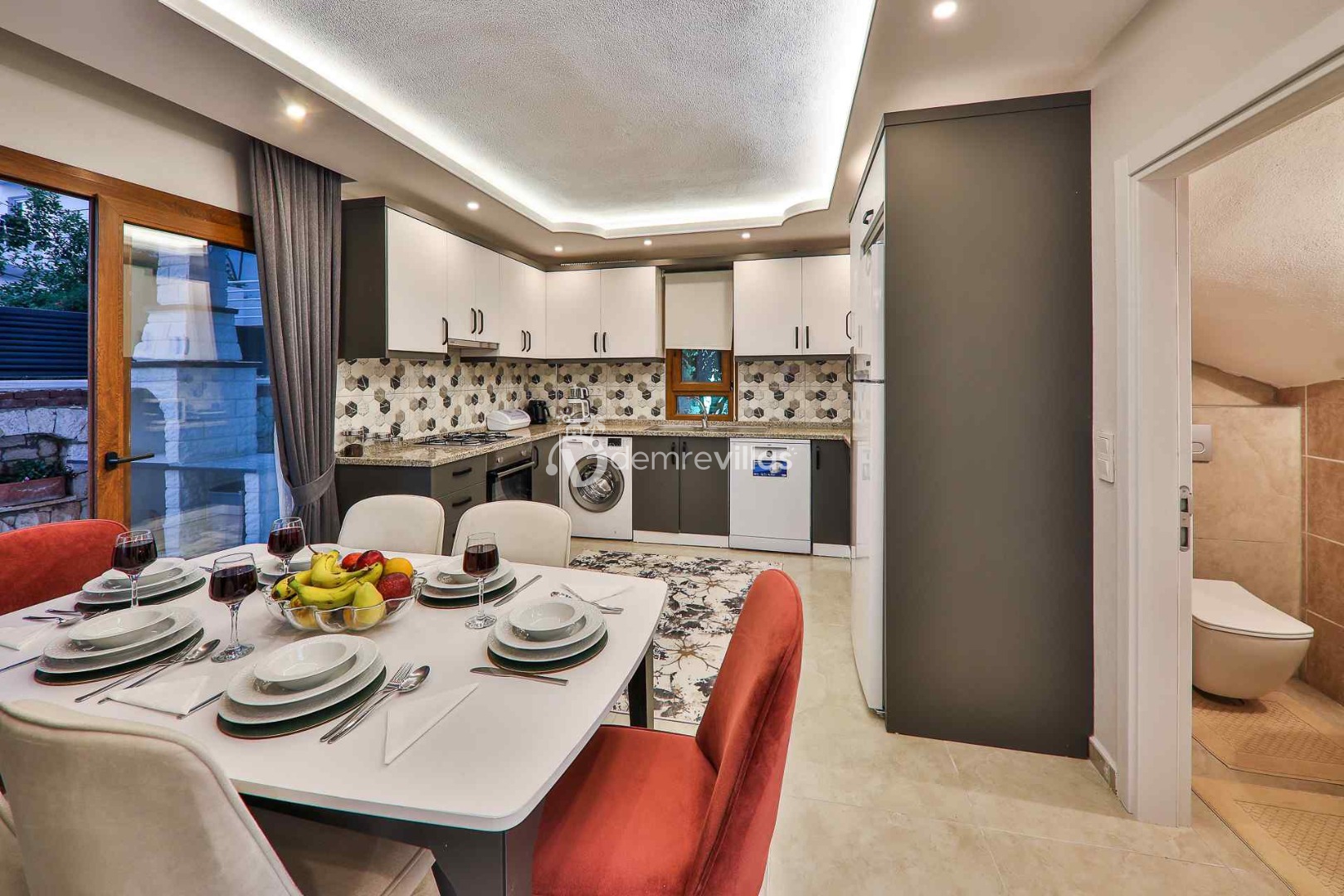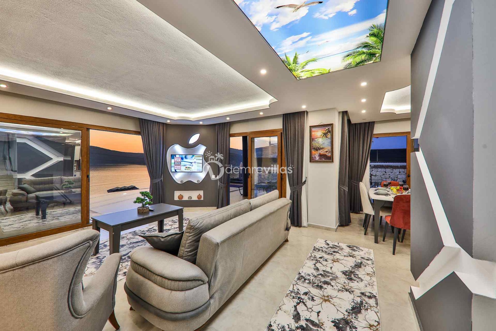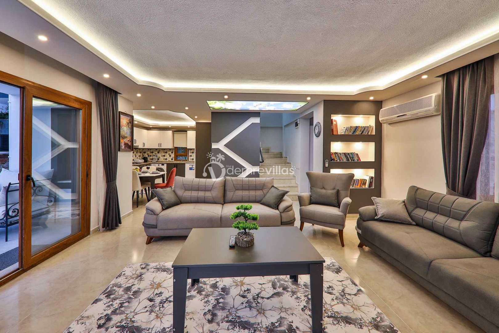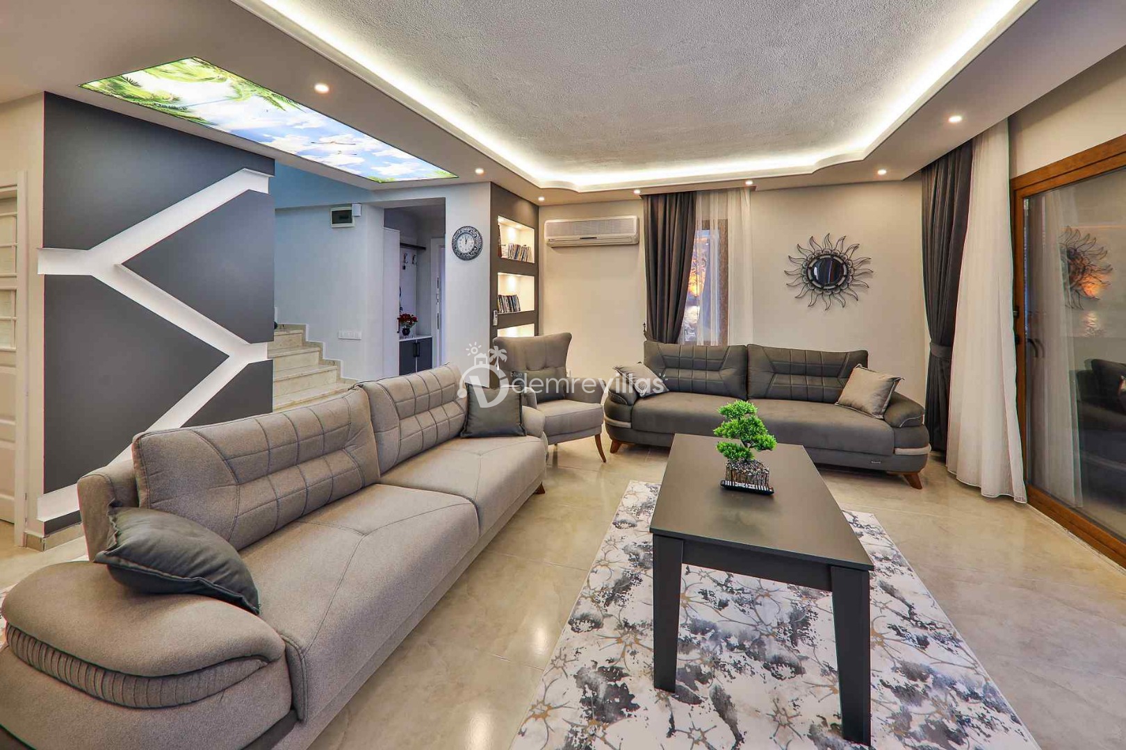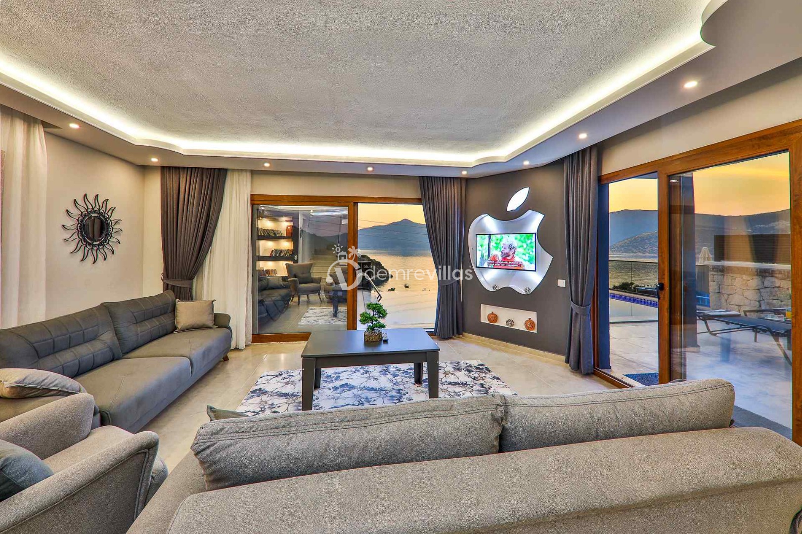 Salon : Aydınlık ve ferah modern dizayna sahip salon içerisinde konforlu ve lüks oturma grubu, TV, DVD oynatcı, klima yer almaktadır. Salondan havuz terasına geçiş vardır.