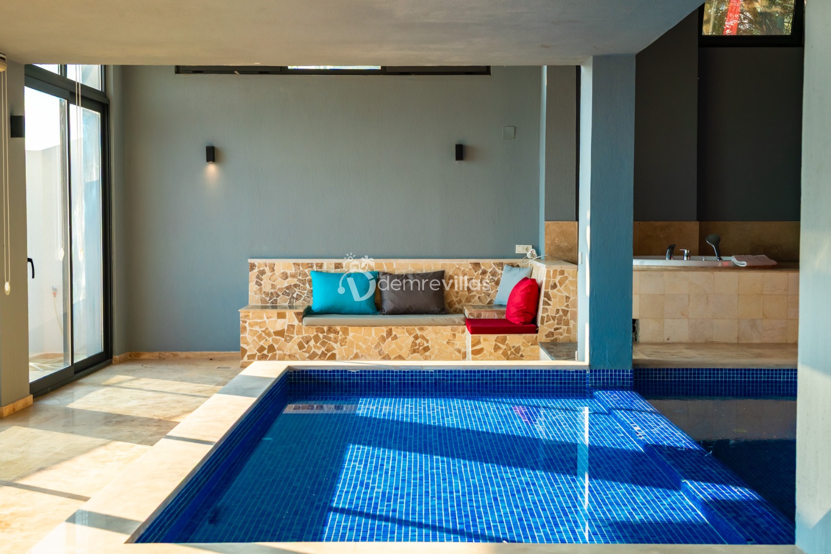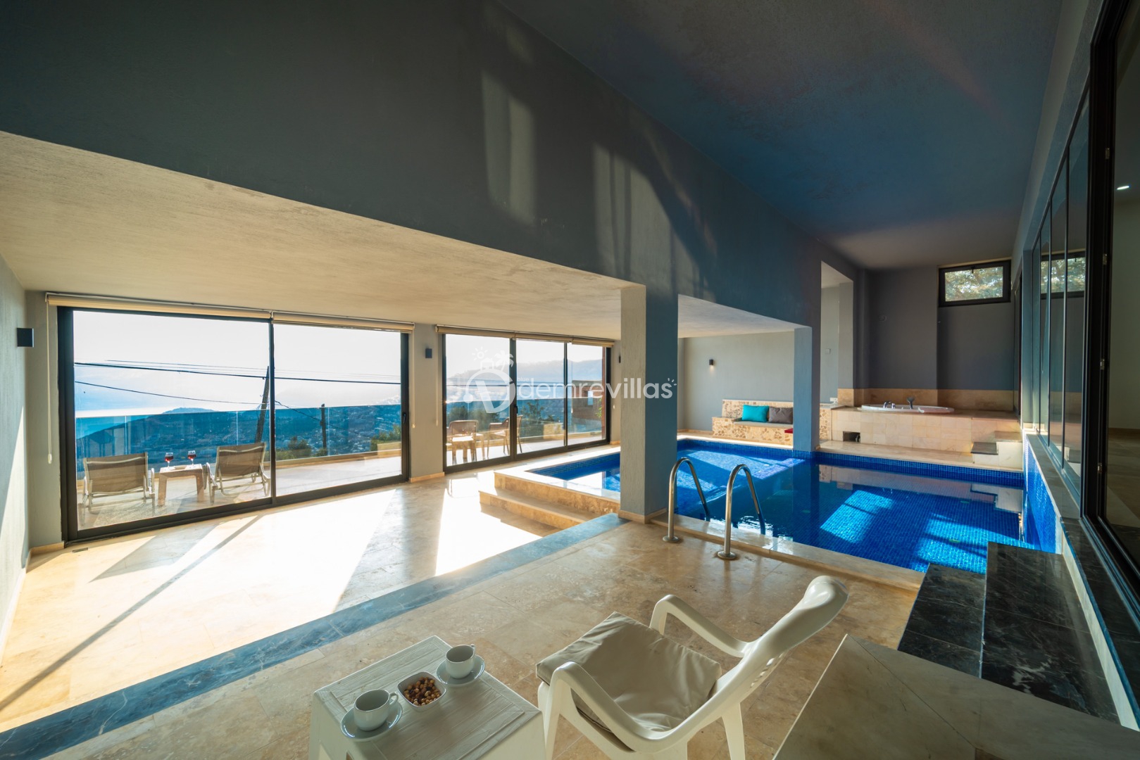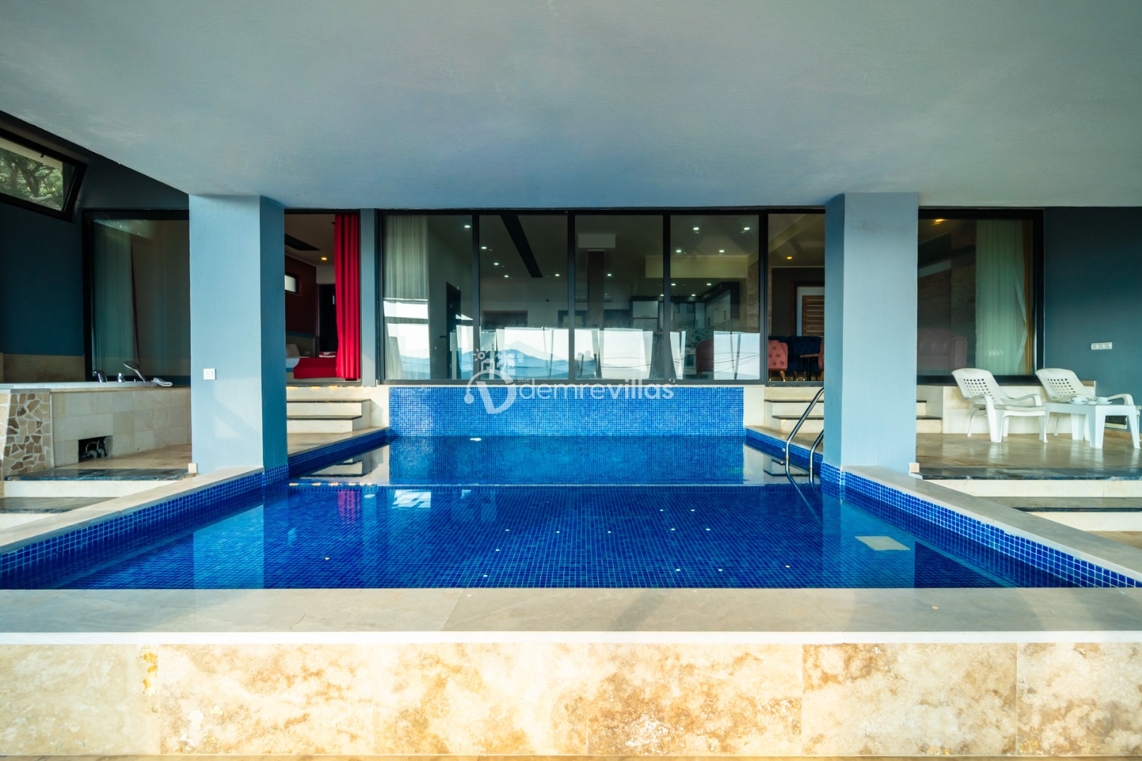 Villamızın havuzu kapalı havuzolarak tasarlanmış olup salon ve yatak odasıyla bağlantılı olarak bulunmaktadır. Isıtma özelliği sayesinde kış aylarında da konaklama yapabilirsiniz.