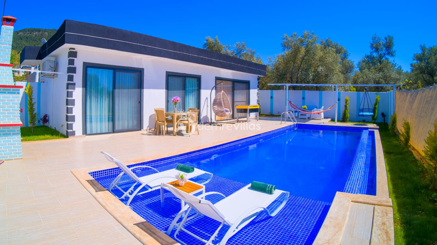 Bahçe : Korunaklı olan bahçemizde; özel havuz, salıncak, bahçe mobilyası, 2 adet şezlong, güneş şemsiyesi, şömine, 4 kişilik sandalye ve masası bulunmaktadır.