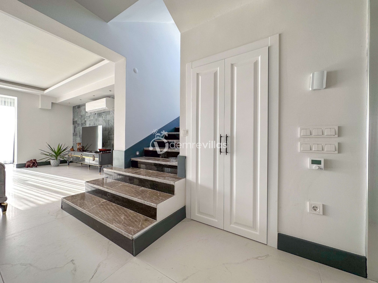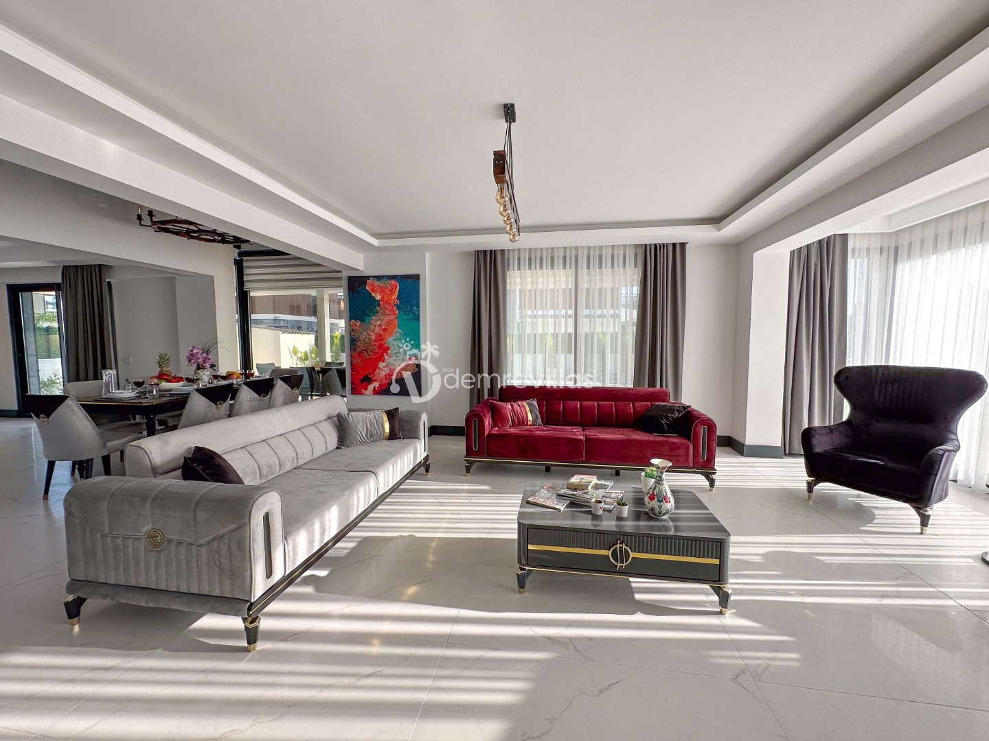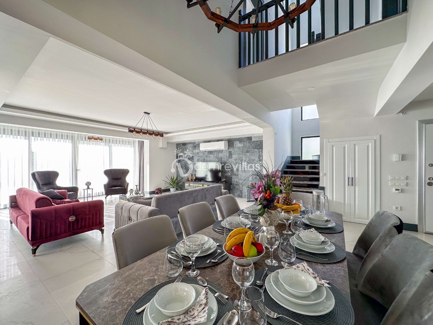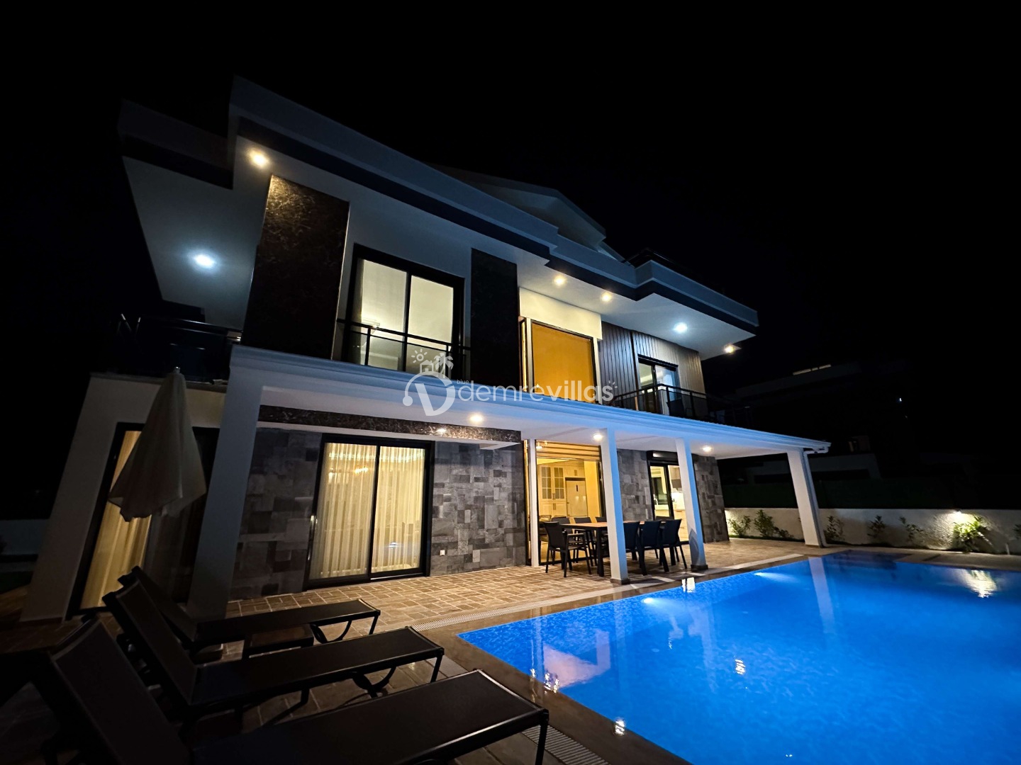 Salon : Oturma grubu, Uydu TV(4K Ultra H), 8 Kişilik yemek masası, Klima, WC/Lavabo ve Havuz kenarına çıkış bulunmaktadır.