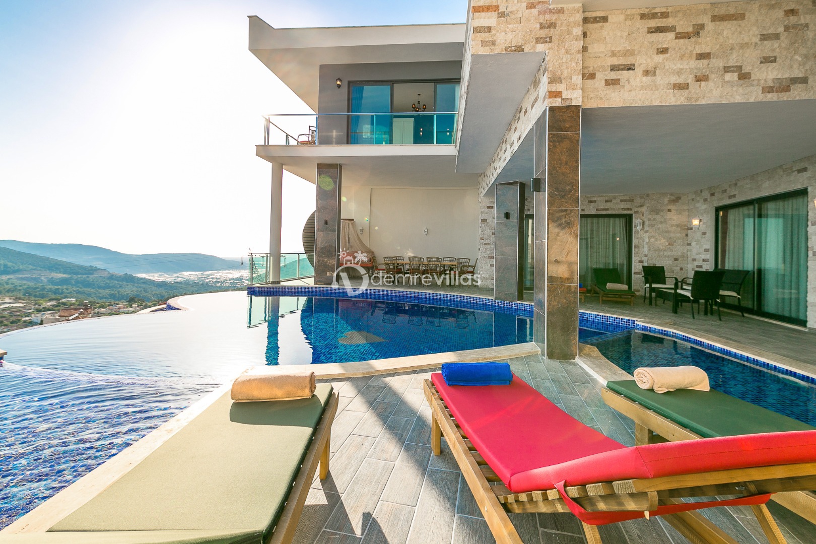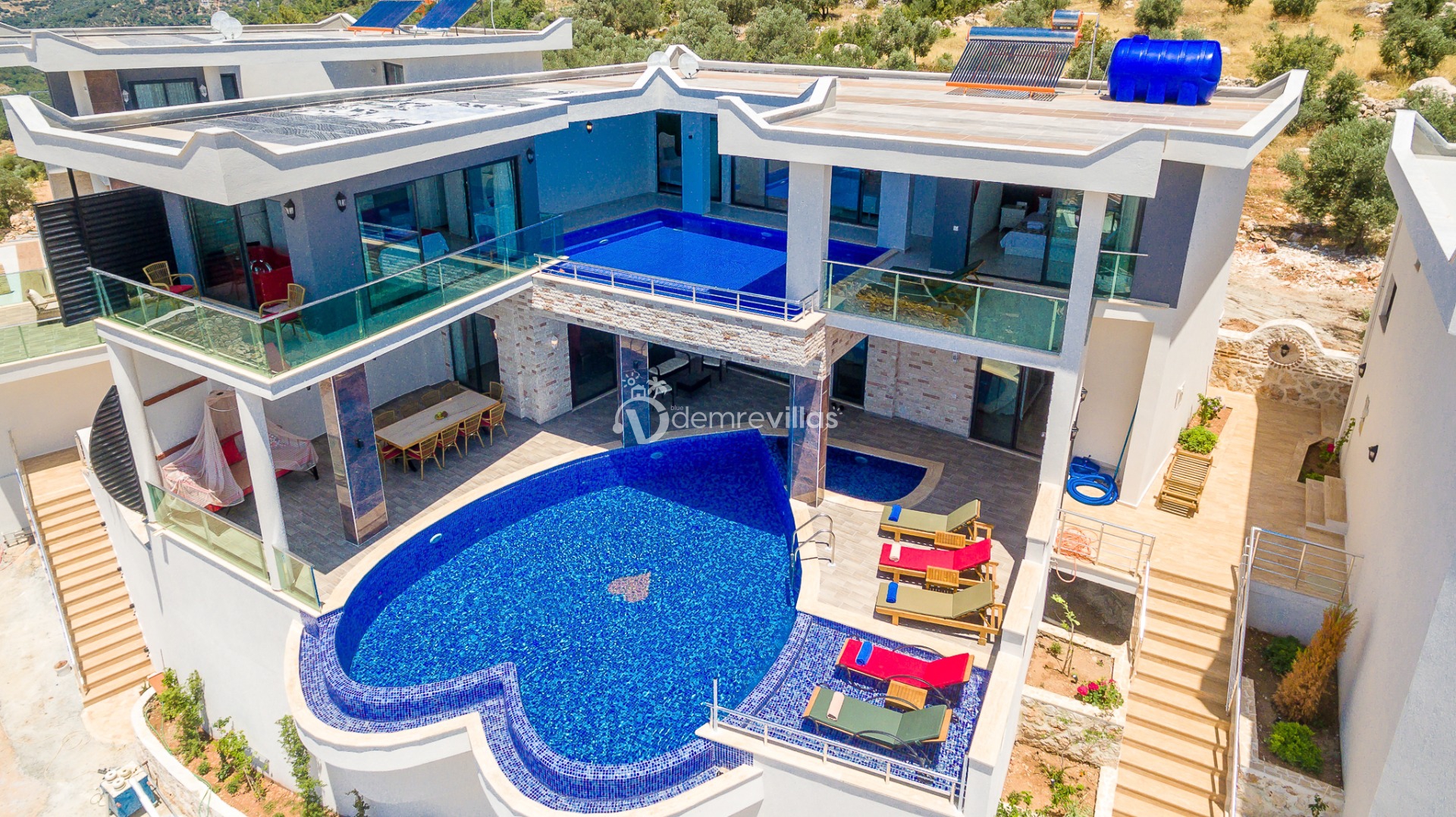 Kalkan Akbel bölgesinde eşsiz deniz ve doğa manzarasını sessiz, sakin, huzurlu bir ortamda lüks ve ayrıcalıklı detaylarıyla siz değerli misafirlerimizin, beğenisine sunan 5 yatak odalı, 10 kişi konaklama kapasiteli kiralık lüks villadır. Büyüleyici deniz ve doğa manzarasına sahip odalarıyla ön plana çıkan villada 2 tane havuz bulunmakta olup; akşamları sevdiklerinizle birlikte unutulmaz anlar yaşayabilirsiniz. Farklı tarzdaki mimarisi ile dikkatleri üstüne çeken villamızın özel yüzme havuzu, çocuk havuzu ve jakuzisi ve ayrıca üst kattaki özel yüzme havuzu sizlere ayrıcalıklı bir tatil imkanı sunuyor. Muhteşem havuzuyla, açık havada yemek alanının ve muhteşem deniz manzarasının keyfini çıkarabilirsiniz. Kalabalık aileler ve arkadaş grupları için oldukça ideal bir yazlık olan villada, kusursuz ve unutulmaz bir tatil geçirmeniz için tüm detaylar en ince ayrıntılarına kadar düşünülmüş ve hizmetinize sunulmuştur.