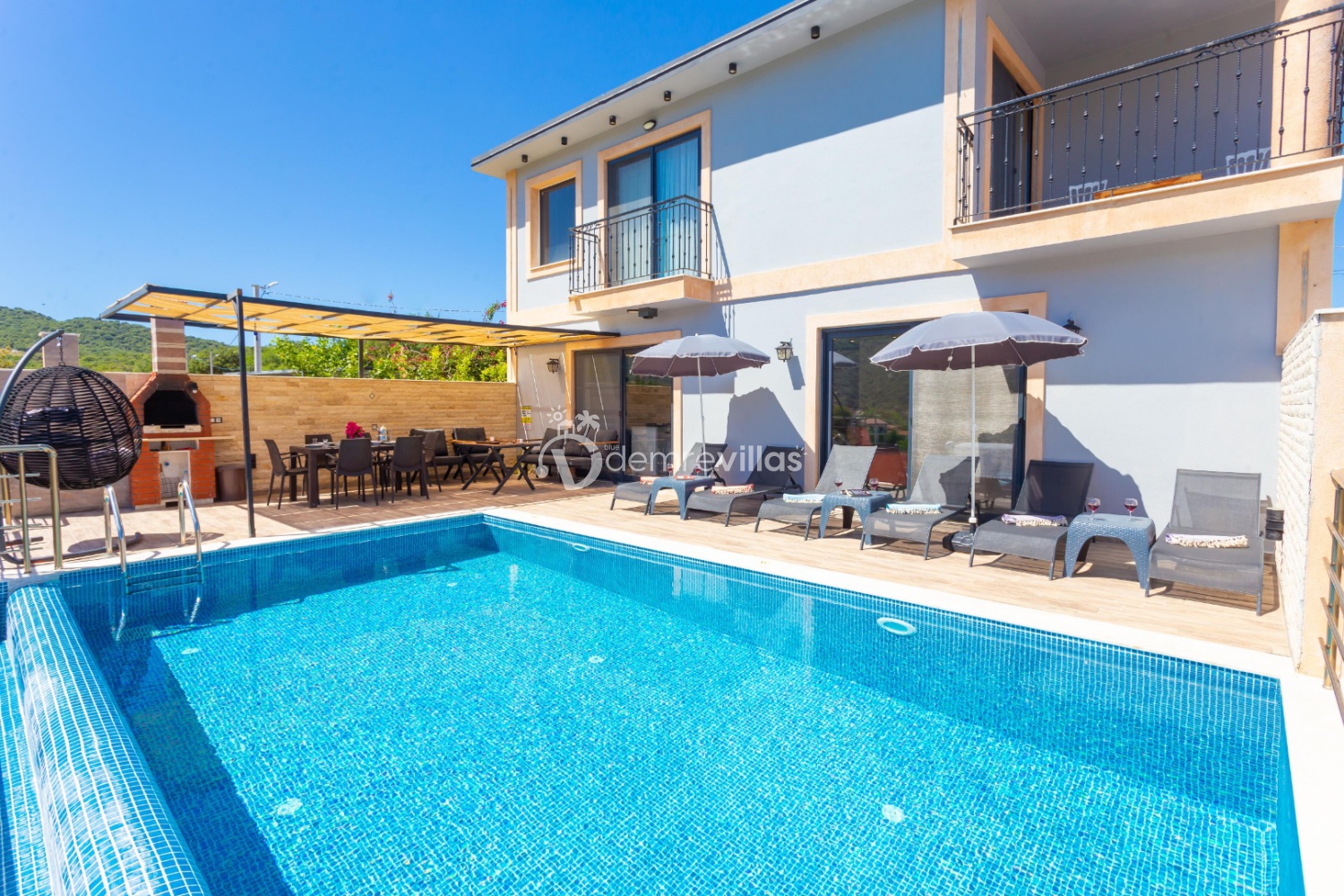 Villamız 4 yatak odası ve 4 banyosu bulunmaktadır. Her odada klima ve özel banyo mevcuttur. Tam donanımlı mutfağı ve bahçesinde bulunan barbekü alanı, konuklarımızın yemek yapma ve evlerinde gibi hissetmelerini sağlar. Villamız, tam da doğayla iç içe, huzurlu bir tatil arayan geniş aile ve arkadaş grupları içindir. Villamız özel bahçesi, yüzme havuzu misafirlerimize rahat bir tatil deneyimi sunmaktadır. Villamızın modern ve ferah iç dekorasyonu, konaklama süresince ev konforunda bir yaşam imkanı sağlamaktadır.