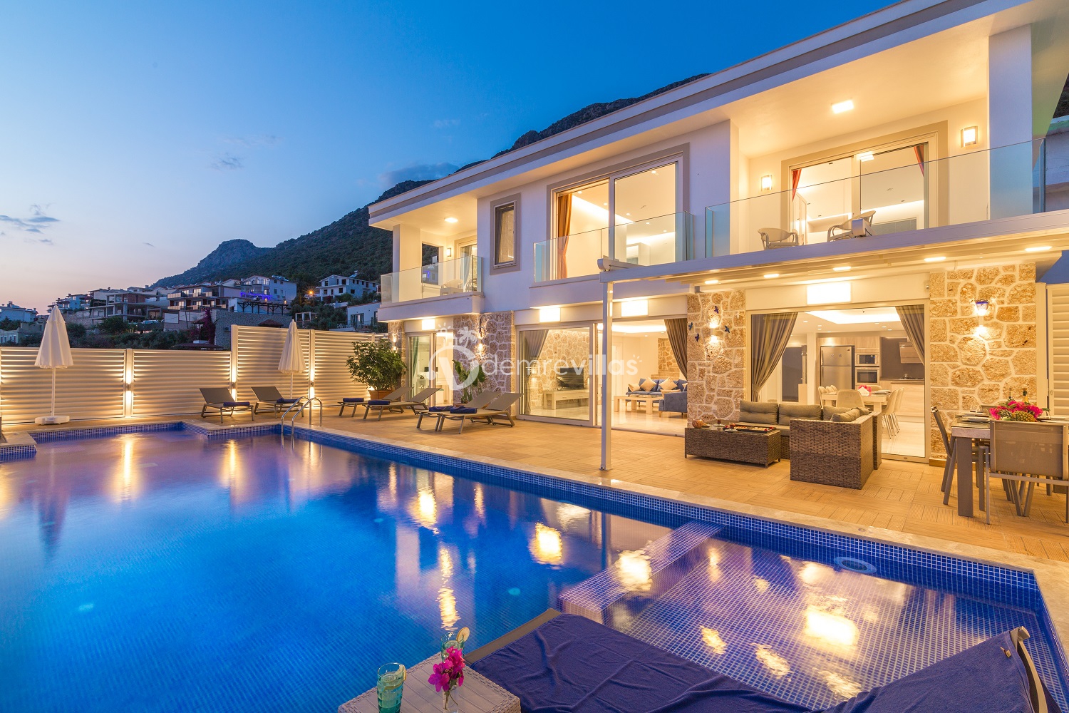 Villamız, Kalkan Kördere mevkiinde konumlu olup modern çizgilerdeki dizaynı ve geniş kullanım alanıyla dikkatleri üzerine çeken bir villamızdır. Oldukça geniş havuz terasının bulunduğu villa, sizlere büyüleyici manzarası sayesinde muazzam bir tatil geçirme imkanı da sunmaktadır. Kalkan koyu, Yılan ve Sıçan adalarını da içerisine alan eşsiz manzaranın keyfine varabilmeniz için büyük camlar ve ışıklandırma gibi ayrıntıların düşünüldüğü villada kaliteli bir tatil ve üst düzey seyir zevki sizi beklemektedir. Villamız toplam 4 yatak odasına sahip olup 8 kişi konaklama kapasitesitelidir. Kalkan merkeze yakınlığı ve en ünlü plajlar arasında yerini almış olan Kaputaş plajına 15 dk lık mesafesi bulunmaktadır. Villamıza ait 200m2 lik yeşil alanlı bir bahçe mevcuttur. Bahçede çocuk oyun parkı, masa tenisi ve langırt bulunmaktadır.
