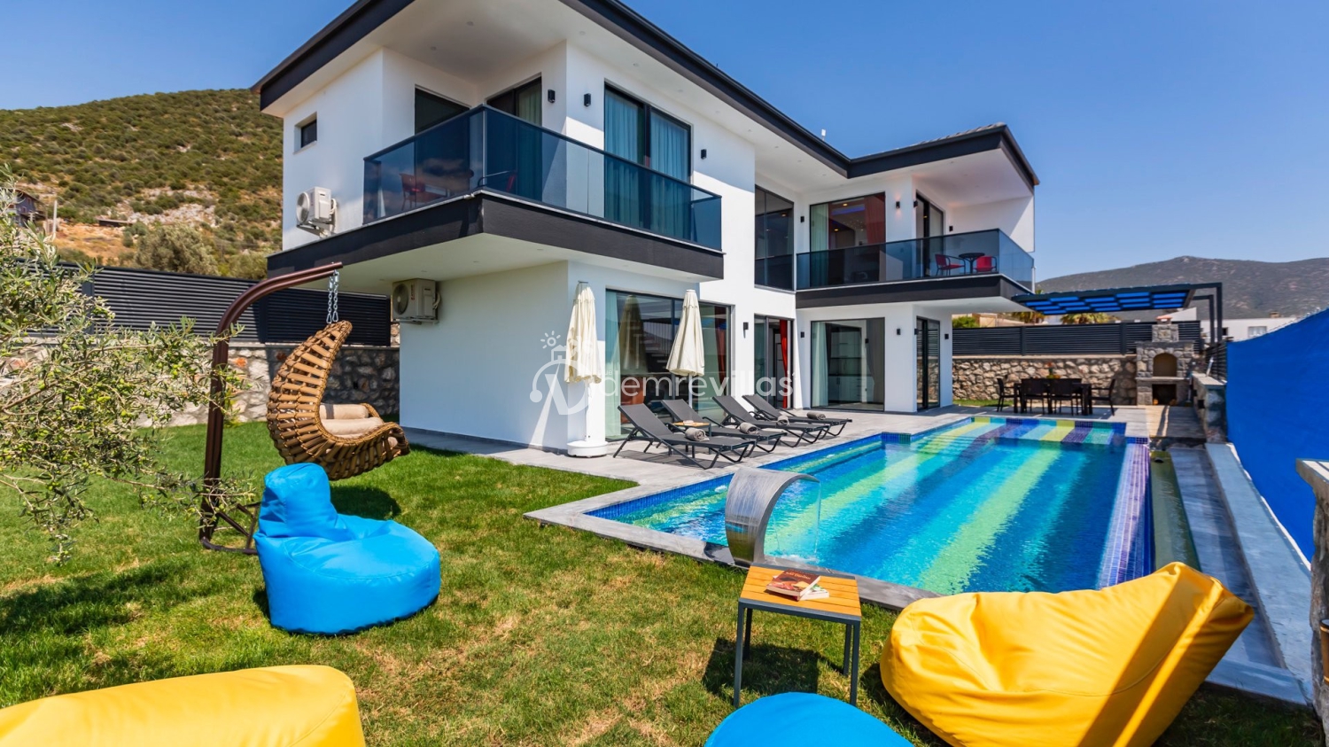 Kalkan Kaş Yeşilköy mevkisinde bulunan Villa'mız, 2 yatak odalı, 4 kişilik konaklama kapasitesine sahip, Doğa Manzaralı, Özel yüzme havuzlu, saunalı, sessizlik ve sakin bir konumda aile ve balayı çiftlerine uygun, oda içerisindejakuzi, Yatay havuzu, doğa ve yeşillikler içerisinde, havuz terasında armut minderler, yemek masası, mangal, salıncak, geniş ve yeşillik alanı ve havuzu dışardan gözükmeyen Muhafazakar Çiftlere Uygun Yeşilköy kiralık tatil balayı villamızdır.