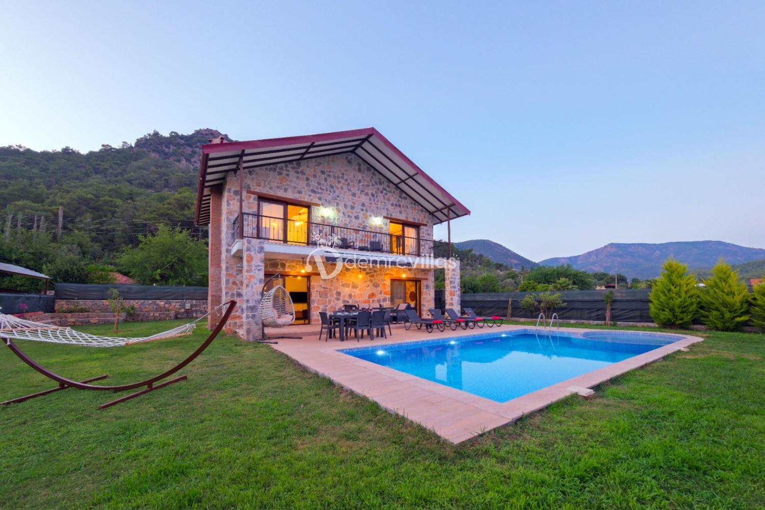 Sessiz sakin bir bölgede gözlerden uzak huzur dolu bir tatil tecrübesi için villamız sizlere daha fazlasını sunuyor. Modern mimarinin kaliteli ve şık eşyalarla birleşerek konforlu ve ferah kullanım alanları sunduğu bu lüks villamız, dünyaca ünlü tatil bölgesi Göcek İnlice köyünde, İnlice halk plajına yürüme mesafesinde ve Göcek şehir merkezine ise 5 dakikalık sürüş mesafesinde yer almaktadır. Muhteşem bir bahçe içerisinde konumlanan bu villamız, çok fazla göz önünde olmayan çocuk ve yetişkin yüzme havuzu, salıncak ve özel otopark alanına sahip, 3 yatak odalı ve 8 kişilik konaklama kapasiteli elit bir villadır. Unutamayacağınız özel bir tatil deneyimi için villamız siz değerli konuklarını bekliyor.