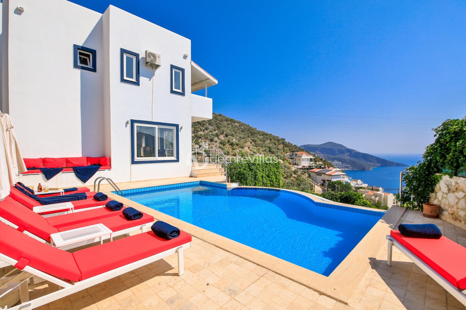 Villamız, Kalkan Kızıltaş Mevkiinde, merkeze sadece beş yüz metre mesafede bulunan on kişilik lüks kiralık villadır. Muhteşem deniz ve doğa manzarasına hakim havuz terasındaki özel yüzme havuzu deniz manzarasıyla bir bütün oluşturur. Beş yatak odası bulunan villamız geniş aileler ya da arkadaş grupları için oldukça idealdir. Tüm odalarından Kalkan’ın eşsiz manzarasını izleyebilirsiniz. Kiralık yazlığımızın geniş havuz terası, ön cephesinde boydan balkonları ve çatı terasında oturma alanları yer almaktadır. Özellikle bahçesindeki kamelyada gölgelenip manzaranın tadını çıkarabilirsiniz.