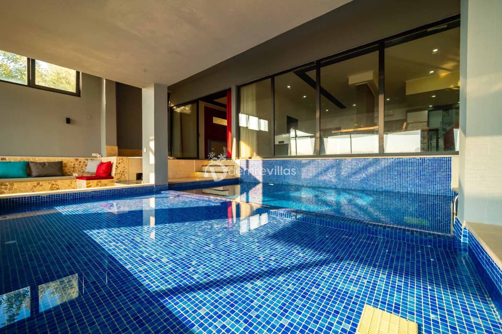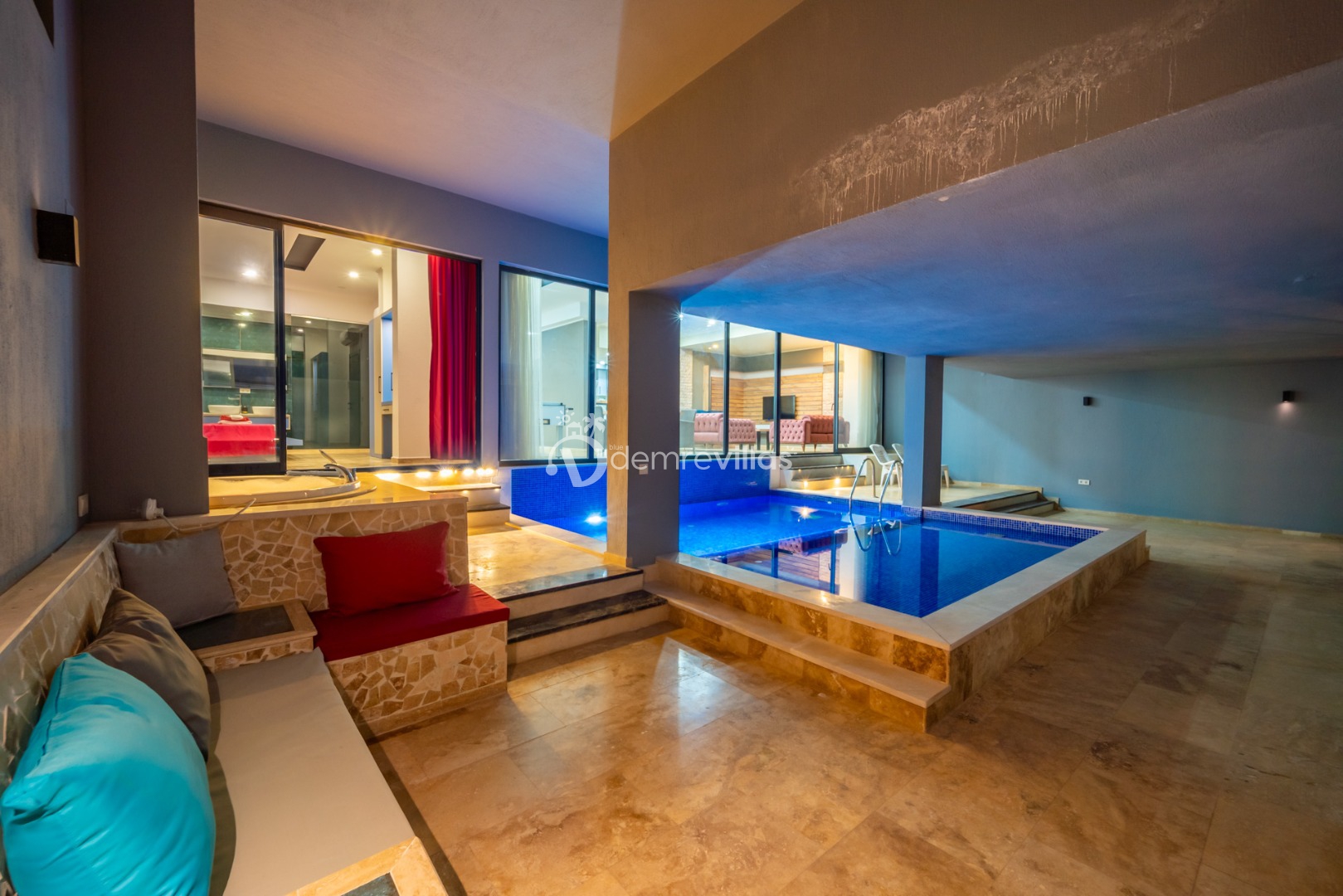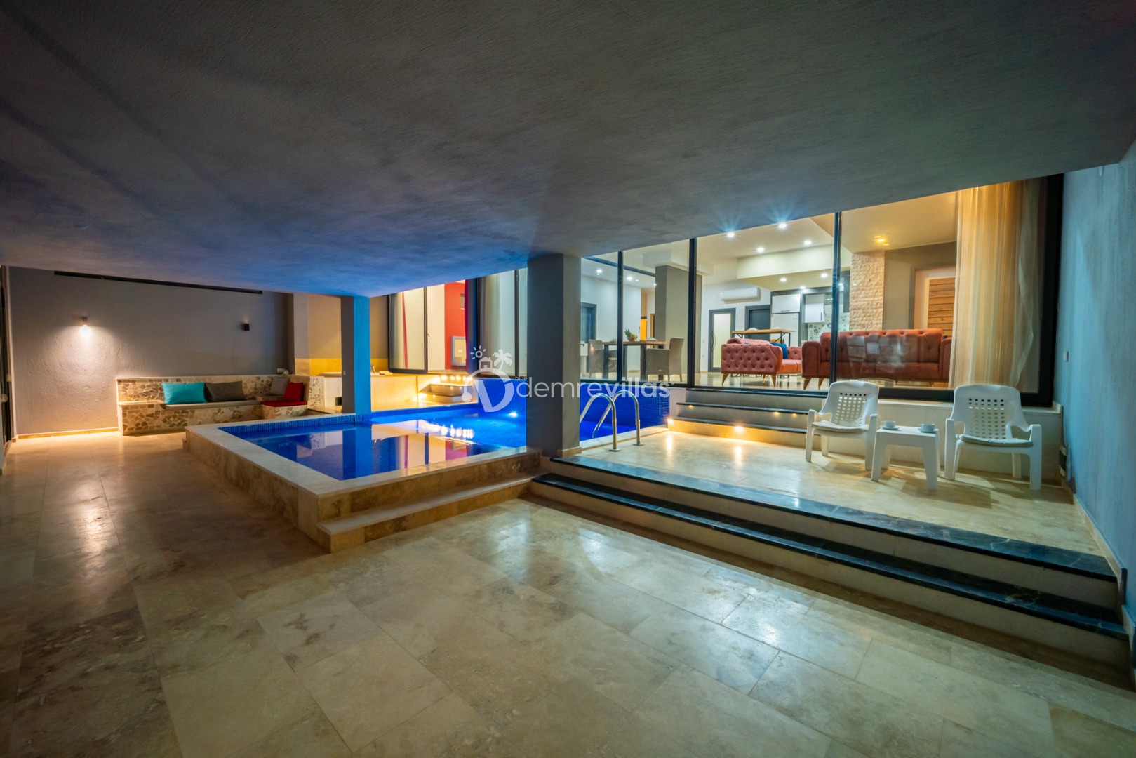 Villamızın havuzu kapalı havuzolarak tasarlanmış olup salon ve yatak odasıyla bağlantılı olarak bulunmaktadır. Isıtma özelliği sayesinde kış aylarında da konaklama yapabilirsiniz.