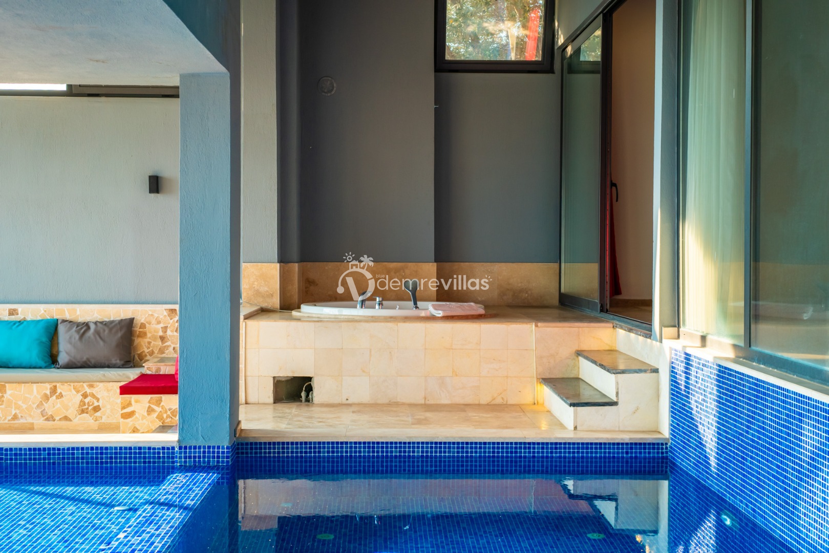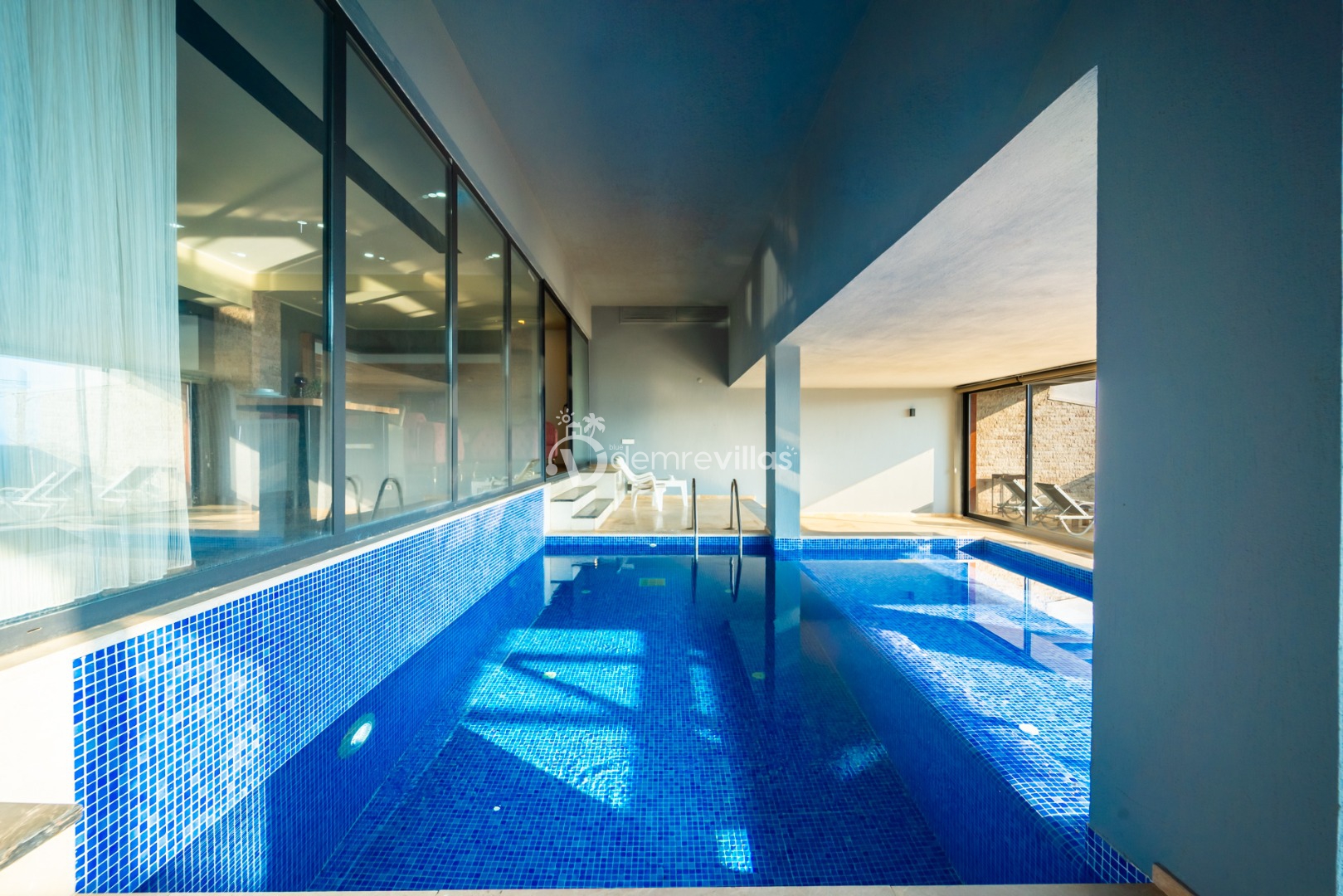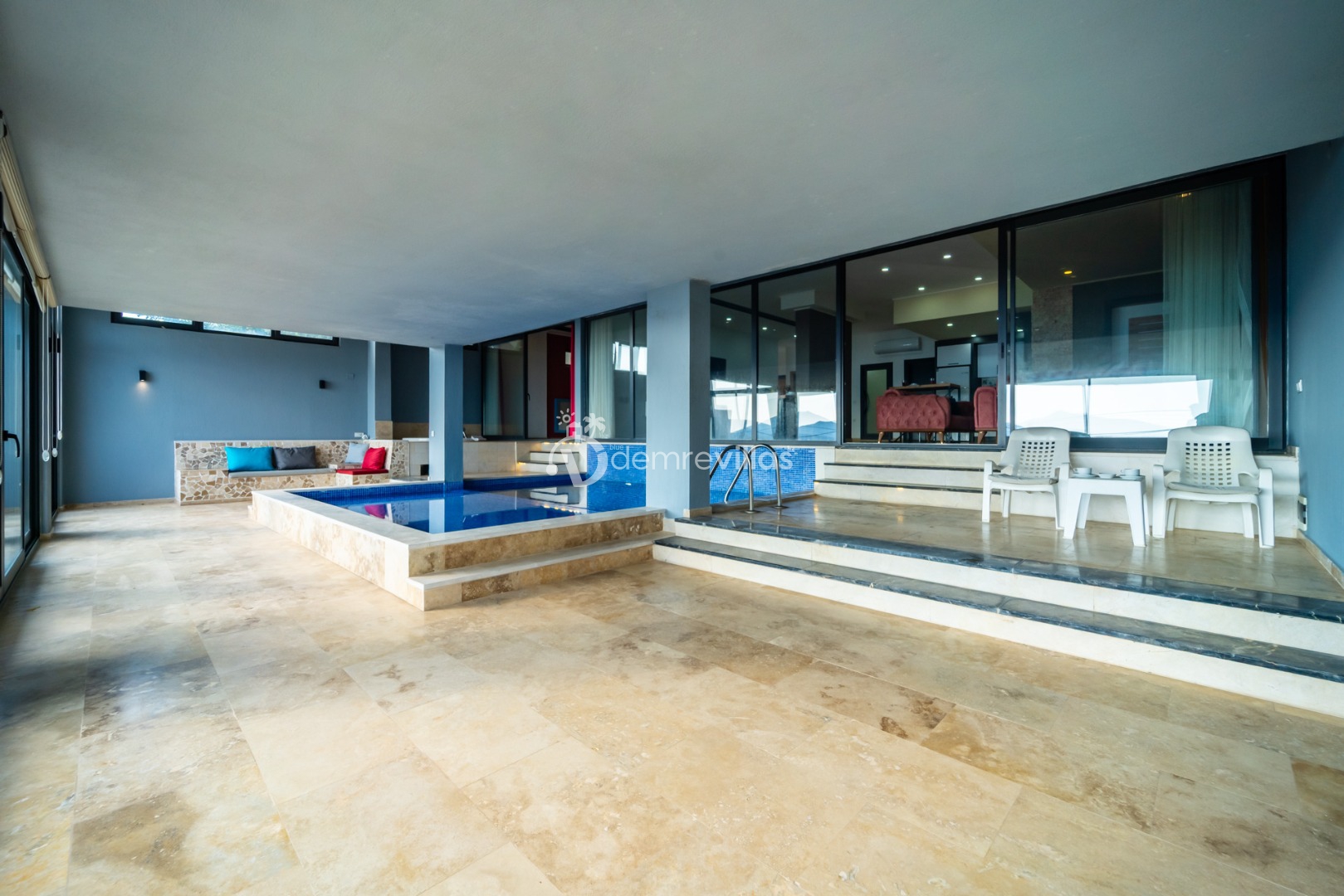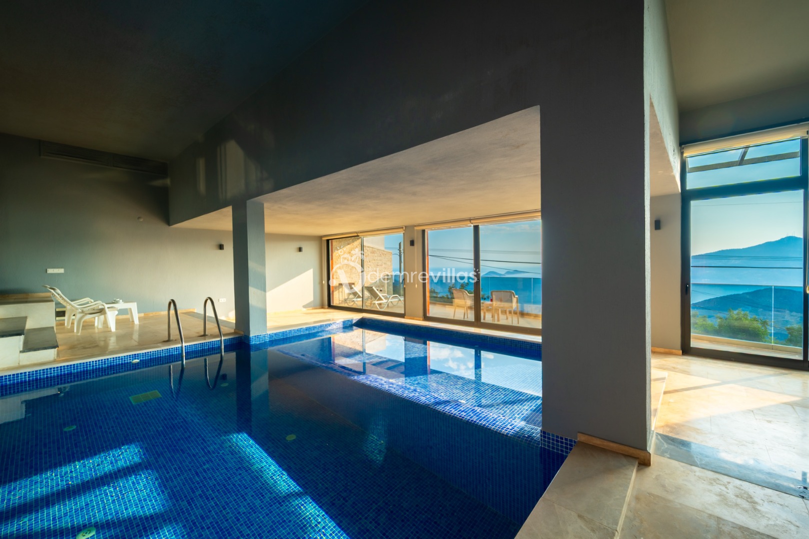 Villamızın havuzu kapalı havuzolarak tasarlanmış olup salon ve yatak odasıyla bağlantılı olarak bulunmaktadır. Isıtma özelliği sayesinde kış aylarında da konaklama yapabilirsiniz.