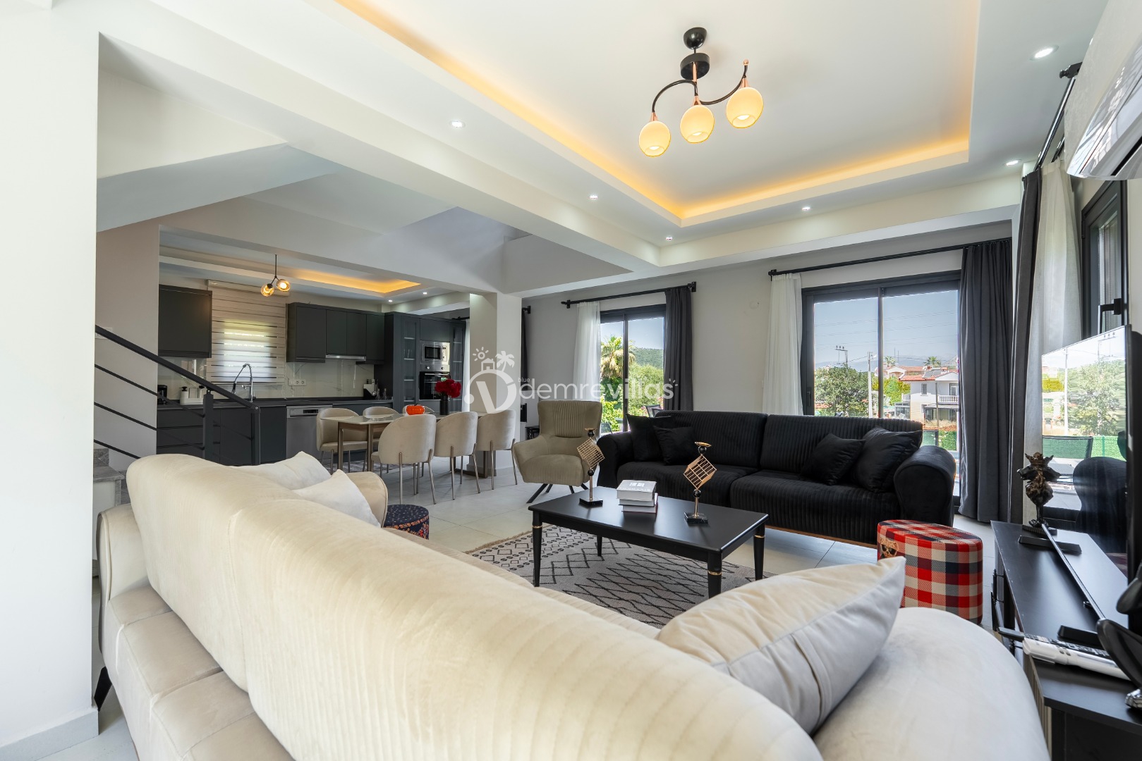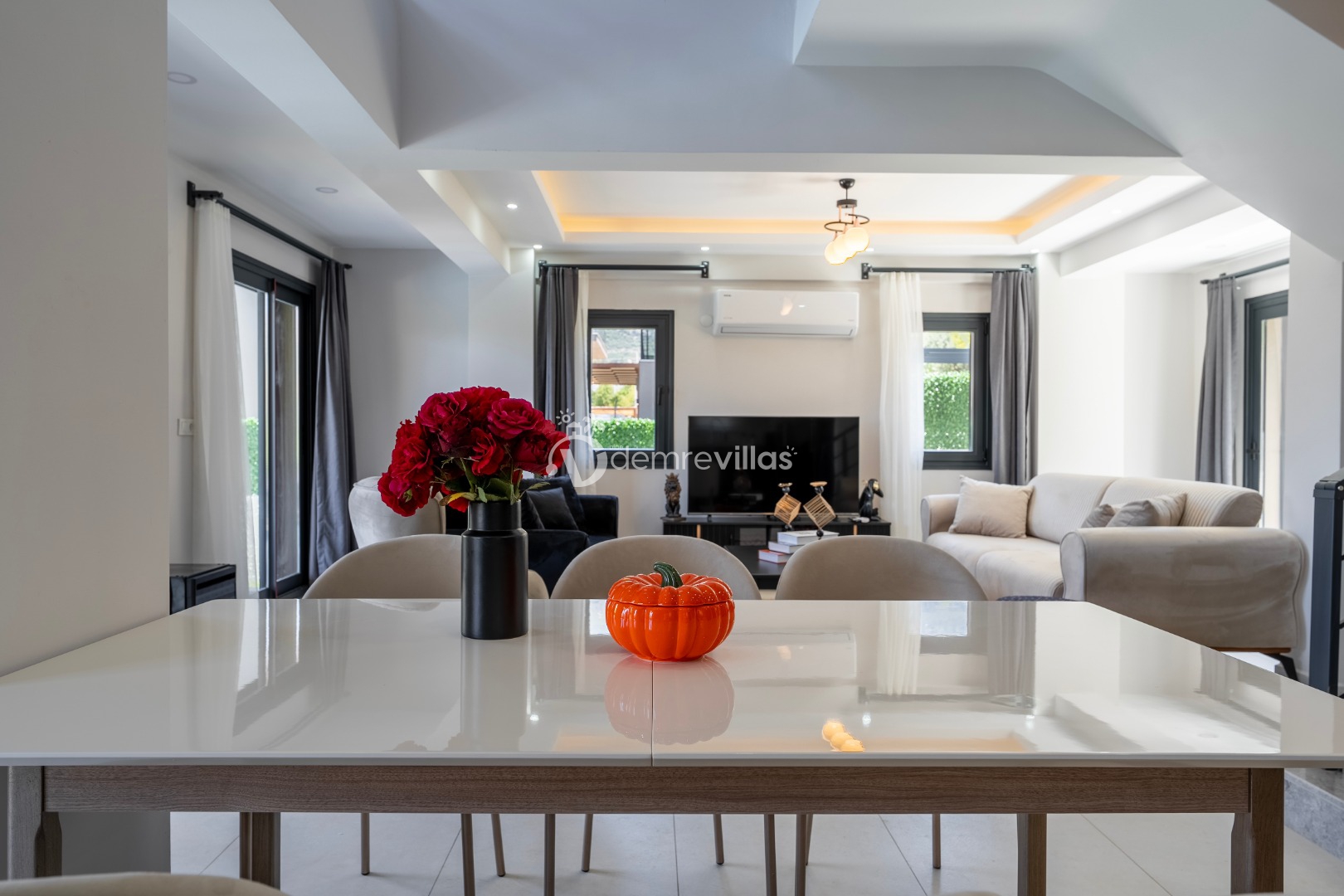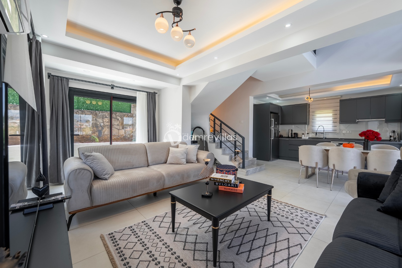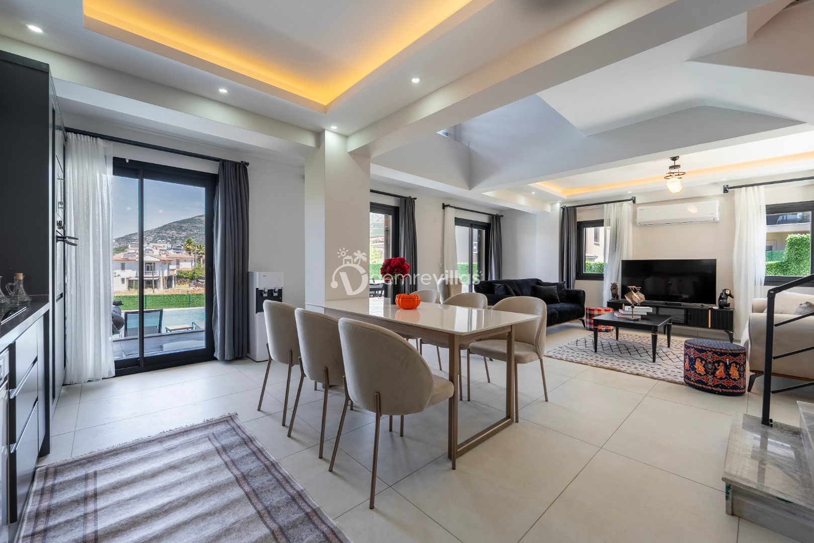 Fethiye merkez, Ölüdeniz ve eğlence mekanlarına oldukça yakın konumuyla da tercih sebebi olan villanın iç mekanı da dış mekan kadar ferah ve geniş bir yaşam alanı sunmaktadır.
