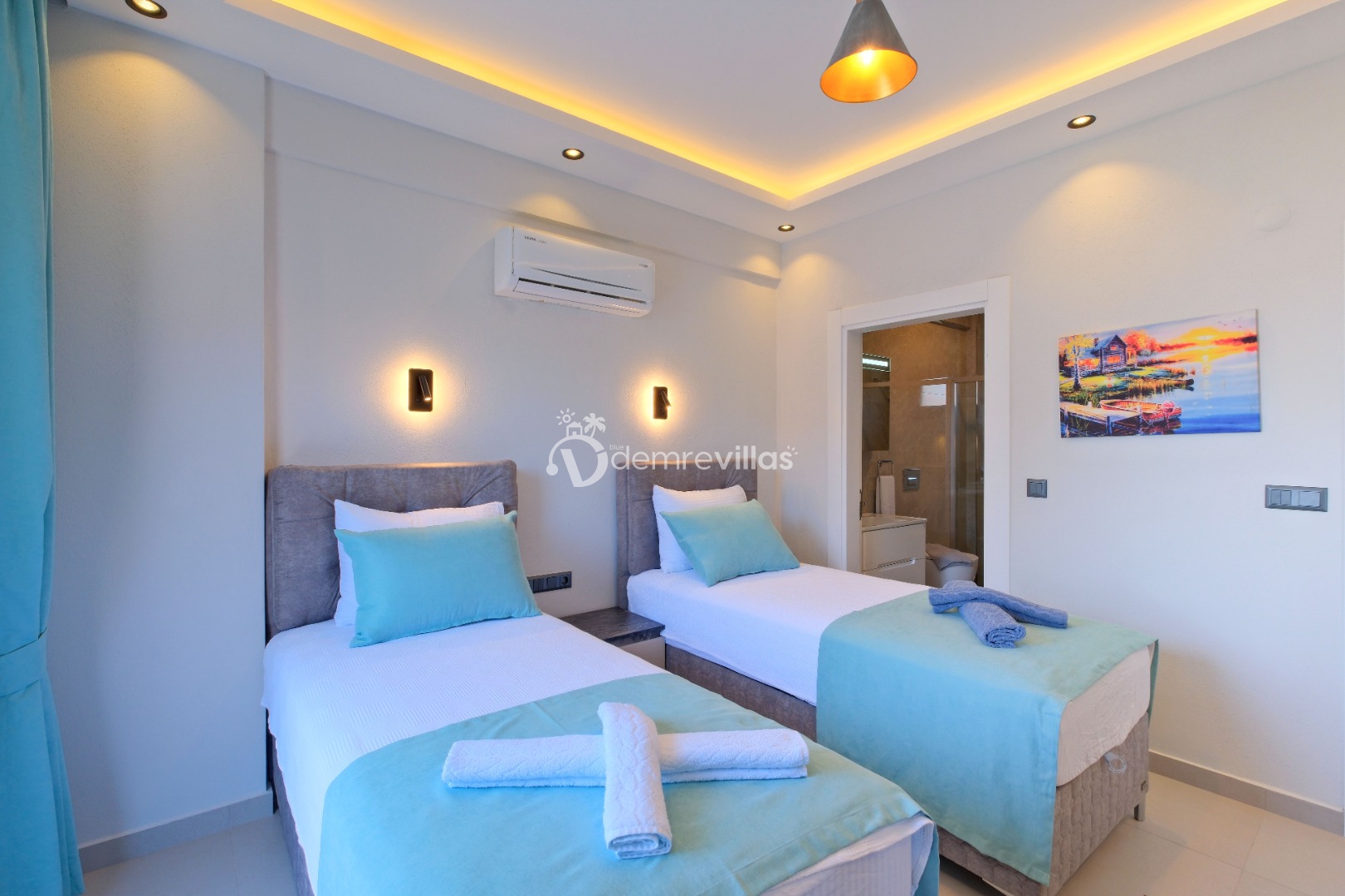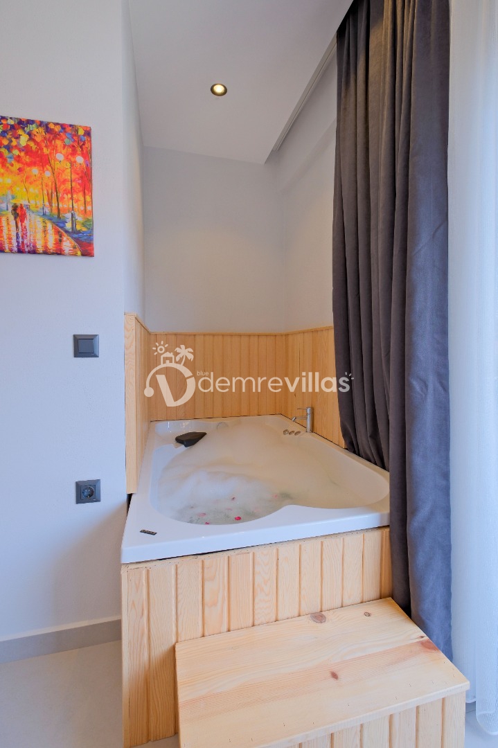 Villanın iç mekânında, ilk yatak odasında çift kişilik yatak, klima, elbise dolabı, jakuzi ve özel banyo/WC, ikinci yatak odasında ise iki adet çift kişilik yatak, klima, elbise dolabı ve özel banyo/WC yer alır; bu düzen misafirlere rahat ve konforlu uyku alanı sağlar. Salon kısmı konforlu oturma grubu, TV, yemek masası ve klima ile donatılmış olup havuz terasına doğrudan çıkış imkânı sunar. Tam donanımlı mutfakta buzdolabı, bulaşık makinesi, çamaşır makinesi ve temel pişirme ekipmanlarıyla ev konforunda yemek hazırlama imkânı mevcuttur.